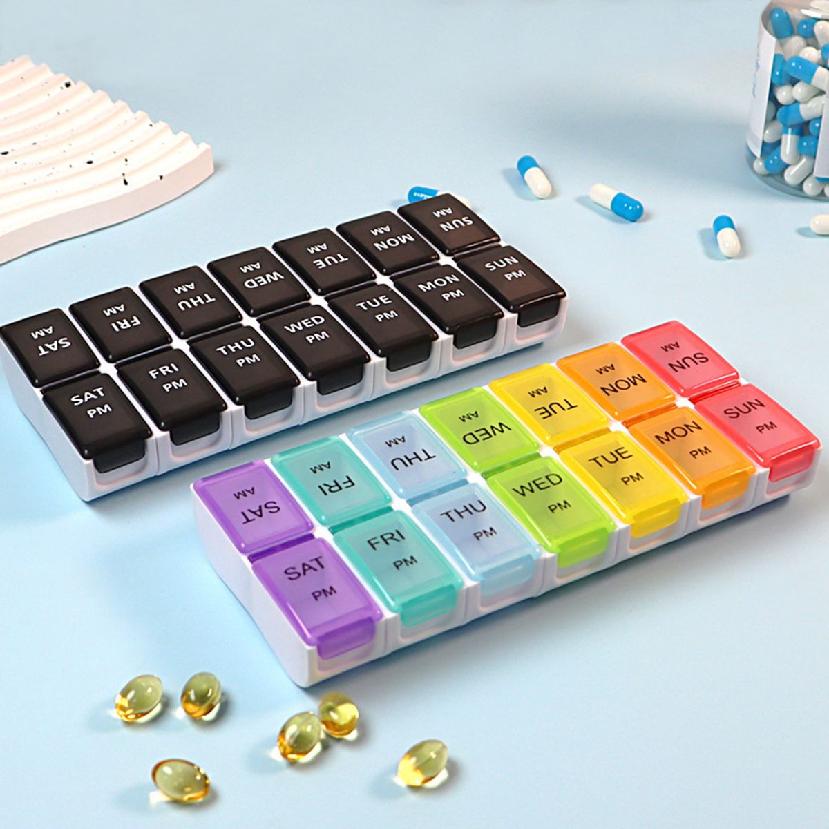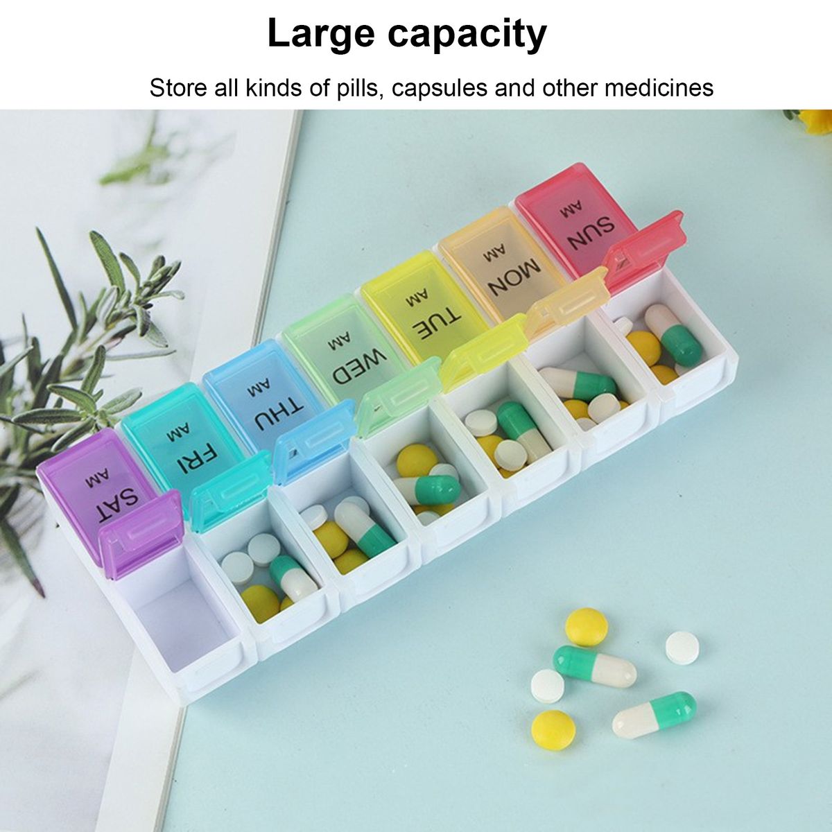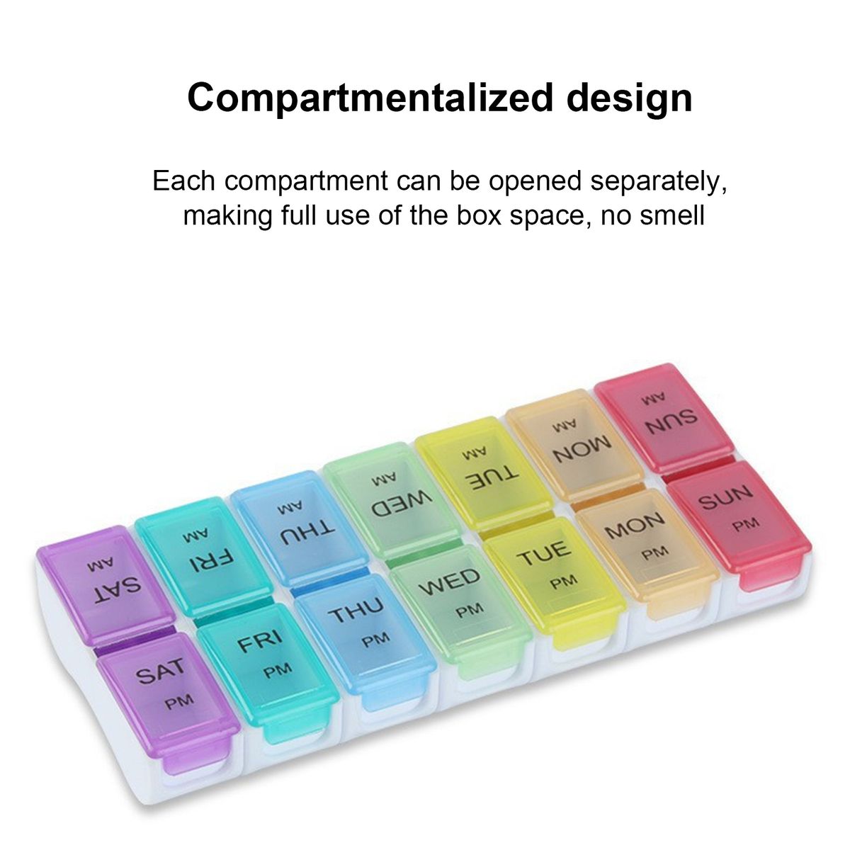 One-week medication: There are 14 separate compartments to contain one-week medication. Besides, am and pm represent 2 times each day to remind you to take pills on time. For those elders with bad memory, this pillbox plays a vital role.