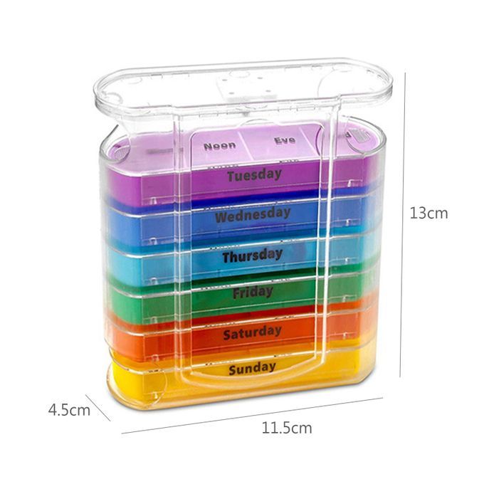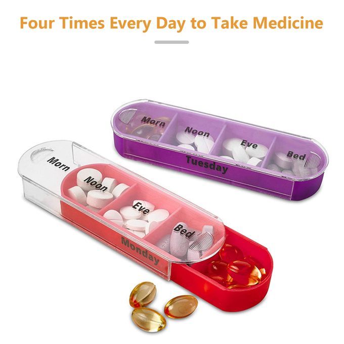 One-week medication: There are 7 separate compartments to contain one-week medication. Besides, the morning, noon, evening, and bed icons represent 4 times each day to remind you to take pills on time. For those elders with bad memory, this pillbox plays a vital role.