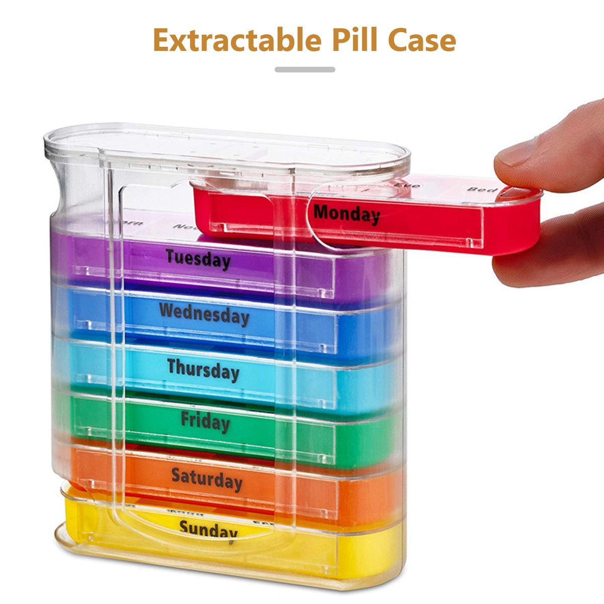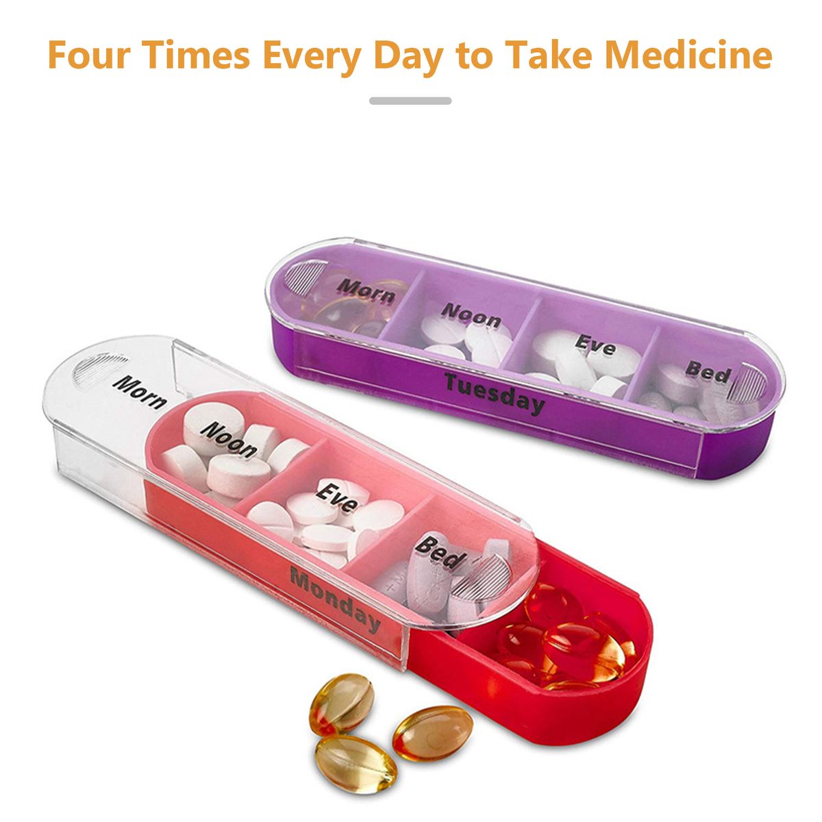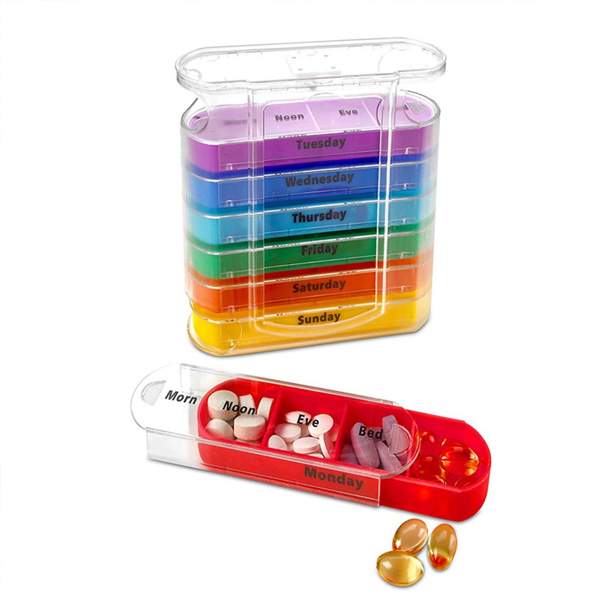 One-week medication: There are 7 separate compartments to contain one-week medication. Besides, the morning, noon, evening, and bed icons represent 4 times each day to remind you to take pills on time. For those elders with bad memory, this pillbox plays a vital role.