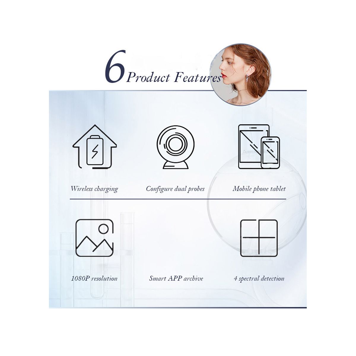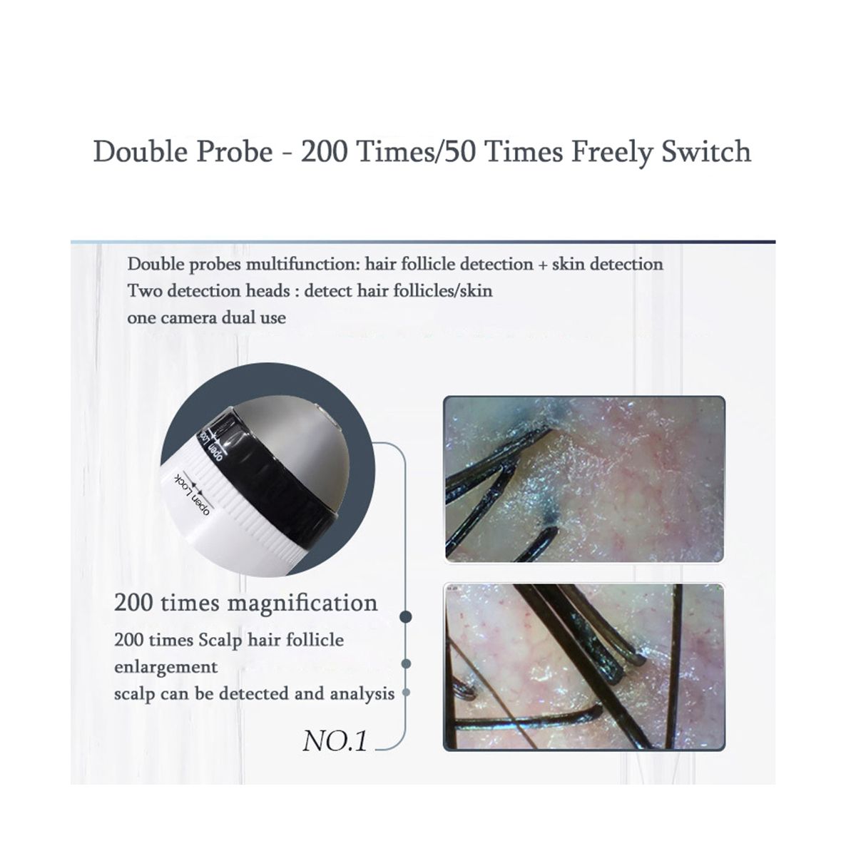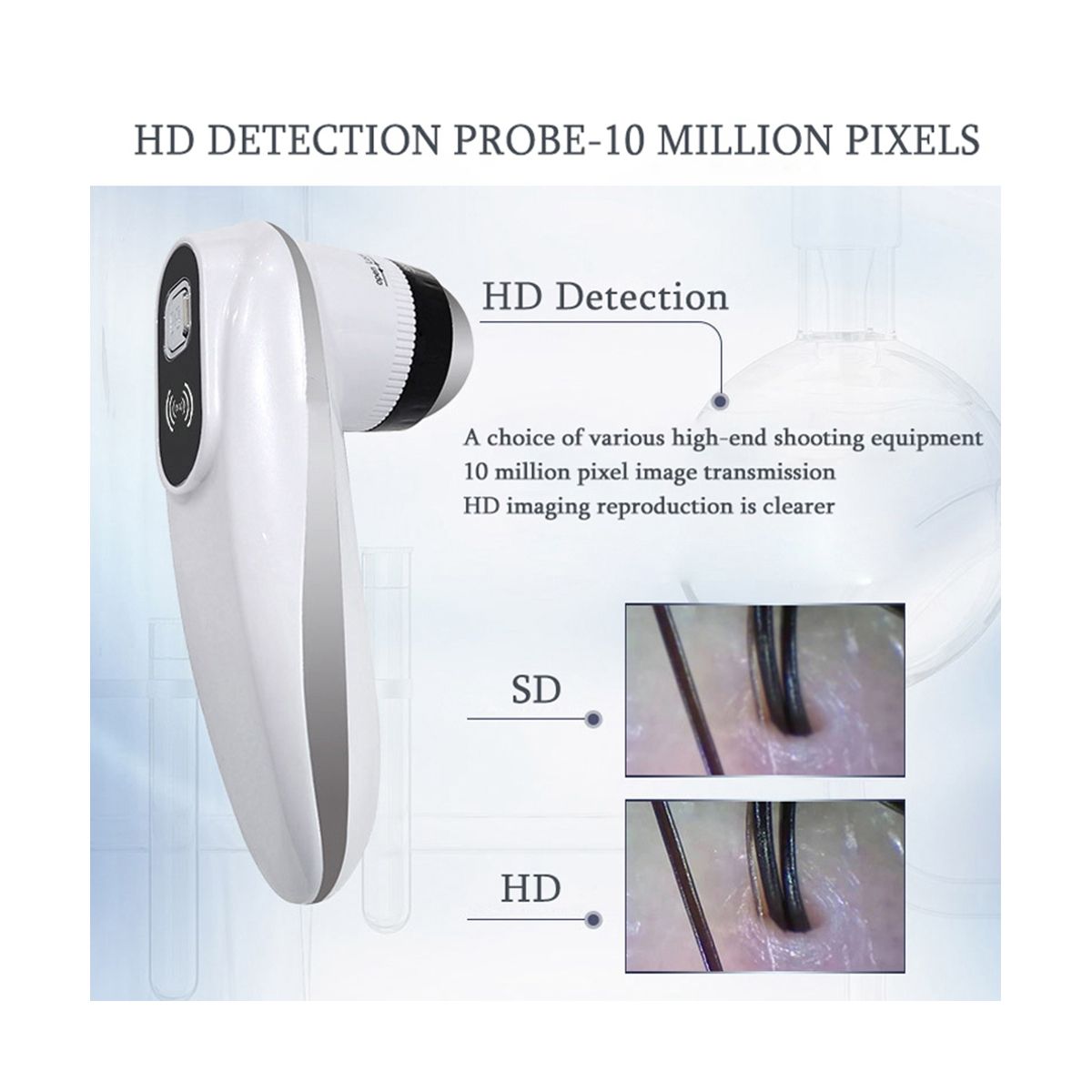 1. Hair follicle skin detector using electronic application technology, elegant appearance, simple operation, through configure dual probes, 1080P resolution, so that the skin detection more clear.