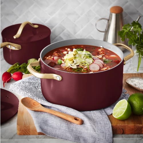 Our Member's Mark™ 11-Piece Modern Ceramic Cookware is a stylish addition to the kitchen that makes healthier cooking easy. Enjoy perfectly cooked steaks, stews, scrambled eggs and sauteed veggies with this versatile set of pots and pans, including two Dutch ovens. Featuring nonstick interiors and durable heavy-gauge aluminum construction, this long-lasting set of cookware makes it so you can cook with less oil and fast cleanup.