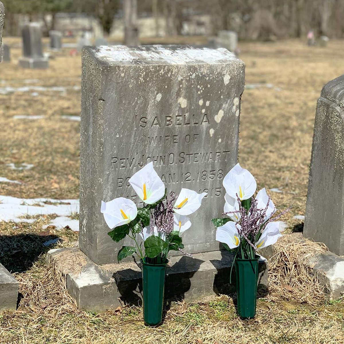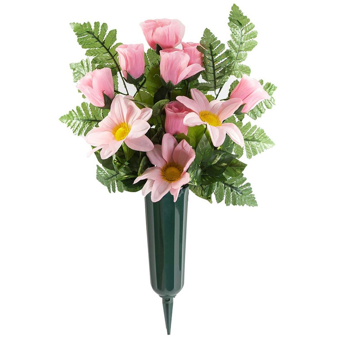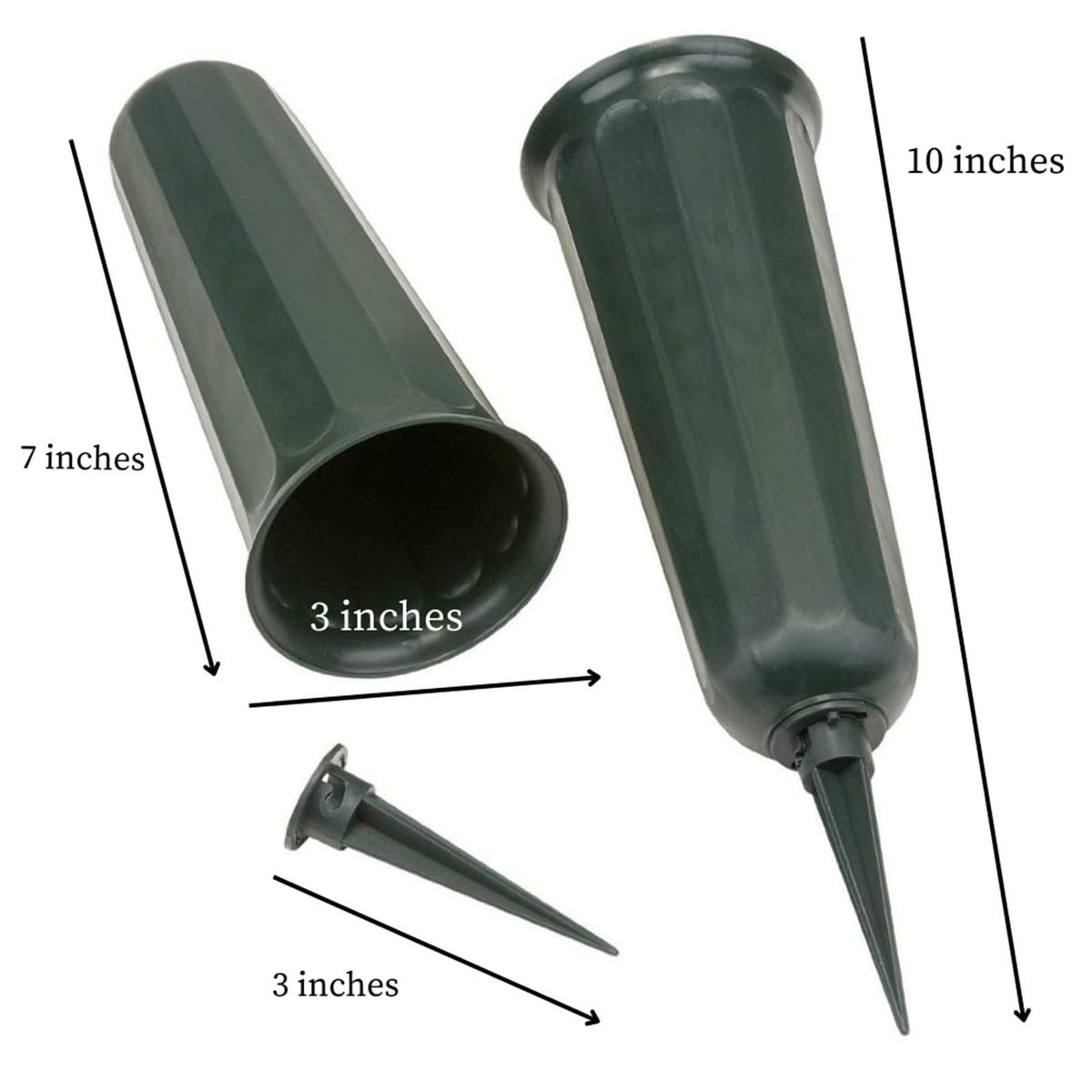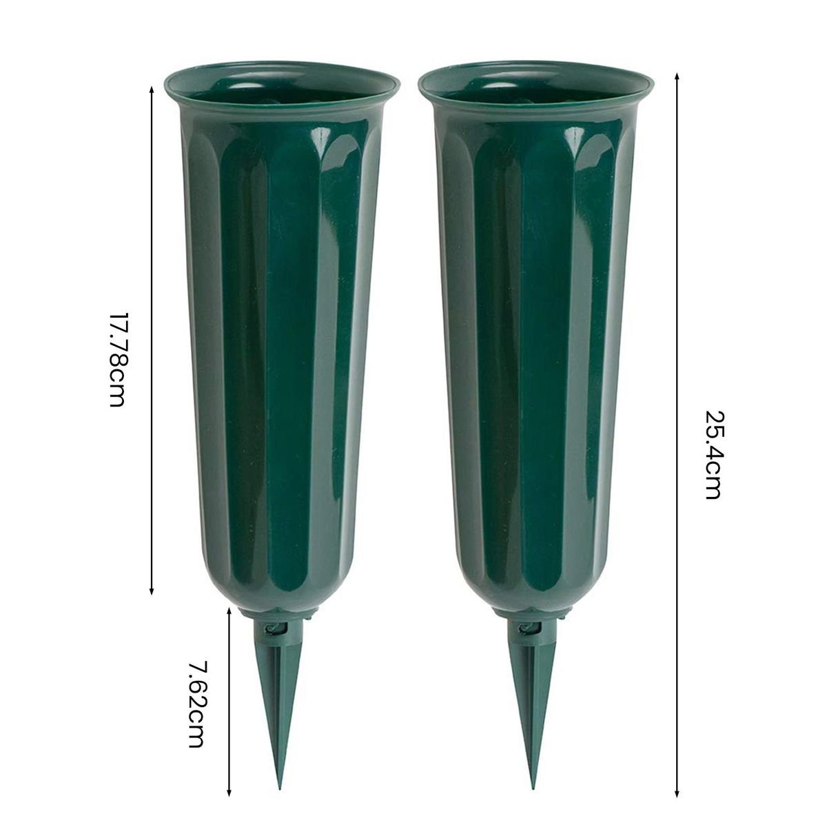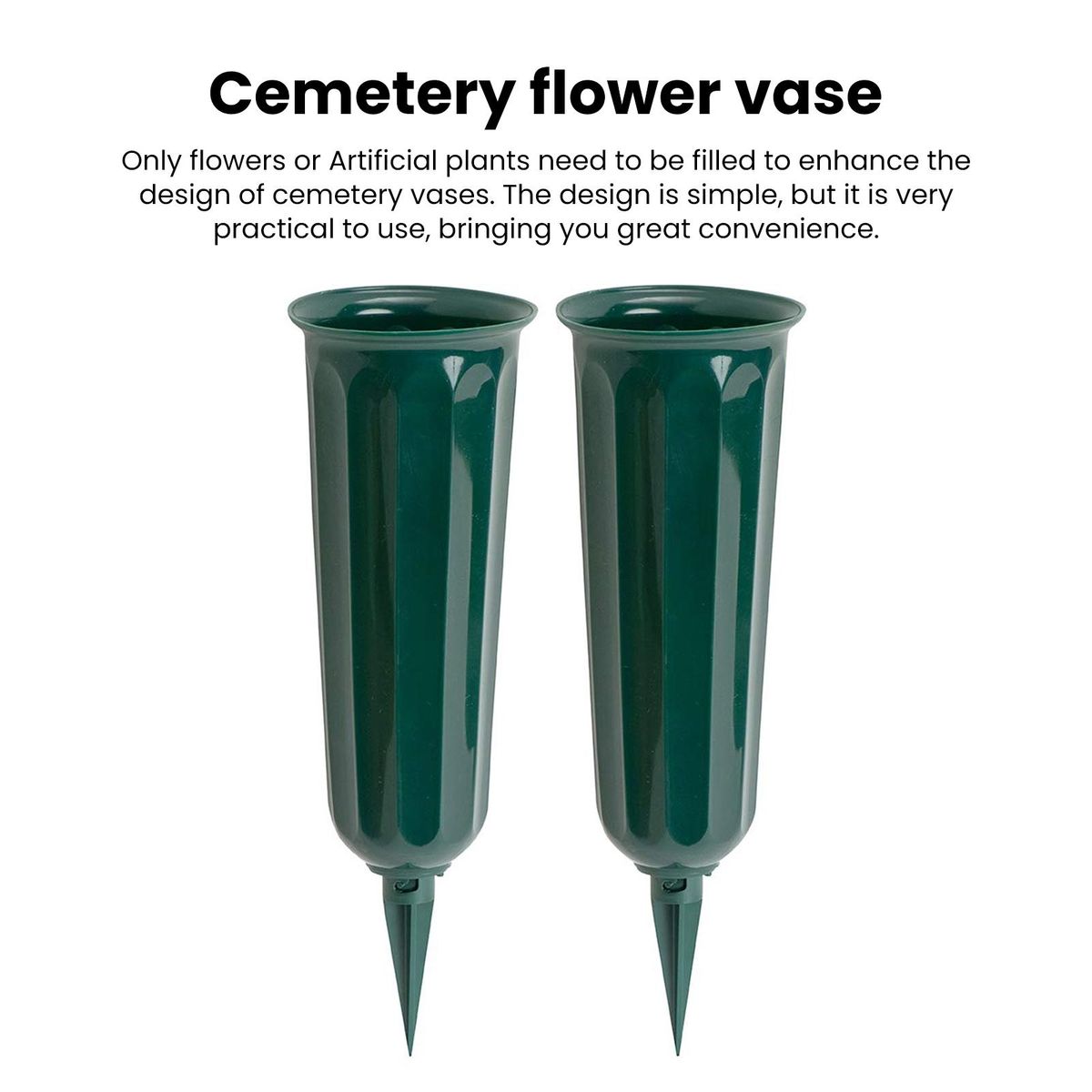 Our set of memorial vases, designed to create a beautiful and heartfelt graveside memorial for your loved ones. these vases are thoughtfully crafted with stakes to ensure they remain upright, providing an elegant and dignified look while keeping floral arrangements intact for longer periods. the tasteful dark green color seamlessly blends with the surrounding grass, adding a touch of sophistication to any cemetery setting.