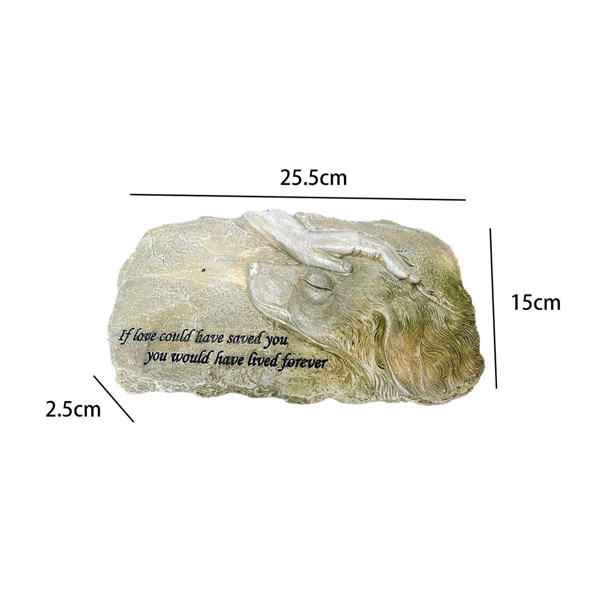 The stone is etched with "If love could have saved you, you would have lived forever" memorial word, with a space for putting photo, you could put photos of your pets on the memorial stone.The pet memorial for expressing sympathy, comfort, remembrance, .Garden stone for loved pet has the lifelike look and feel of a real stone.This memorial stone is designed to be outside in the backyard lawn or garden.Each piece is made from durable resin material that is designed to prevent cracks, chips and fading. This pet statuary will withstand any weather conditions.This nicely crafted pet Memorial Figurine is a beautiful tribute to a beloved pet.