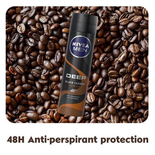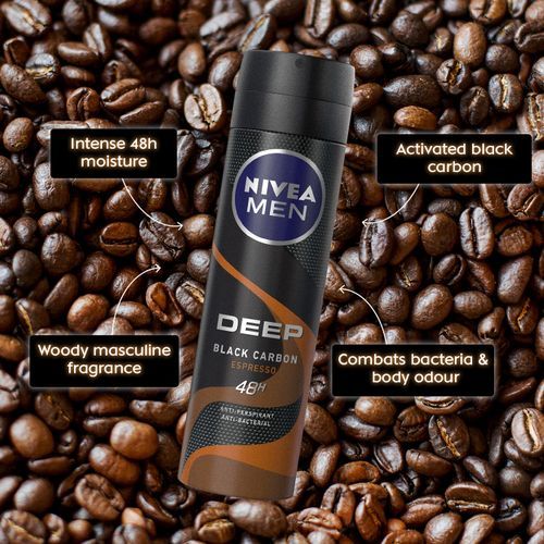 NIVEA MEN DEEP Antibacterial Anti-perspirant protects the skin from sweat and bacteria for long-lasting dryness, a clean skin feel and leaves no visible black residue behind.The effective formula with Black Carbon acts powerfully against bacteria and is complemented by a modern, masculine and sensual scent; Espresso.Discover this new tempting and addictive fragrance blending fresh pineapple and espresso ristretto with a touch of spices and dark chocolate. Unleash your senses by diving into this world of sweet seduction fused with precious lavender and magnetic woods.