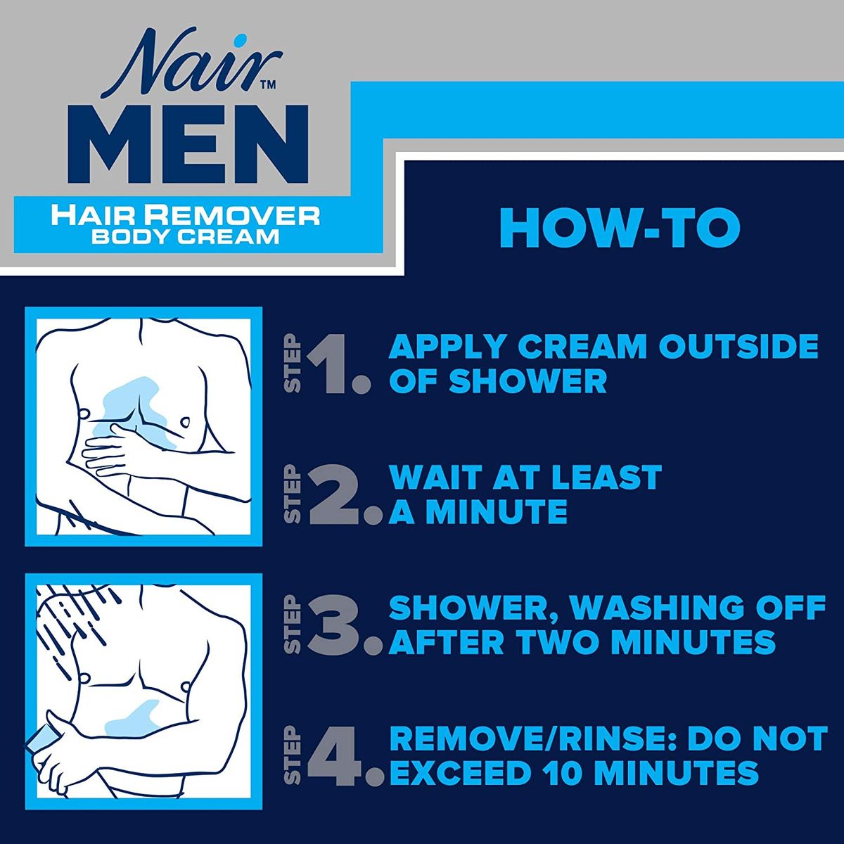One (1) 13-ounce bottle of Nair Men Hair Remover Body Cream, Body Hair Remover for Menimple and effective depilatory cream for men that offers smooth skin that lasts days longer than shavingCream hair remover that is quick and easy to use and can stay on in the showerFormulated for use on back, chest, arms and legs; not for use on the head or faceEasy, fast and pain-free hair remover cream for men is effective on coarse, thick hair