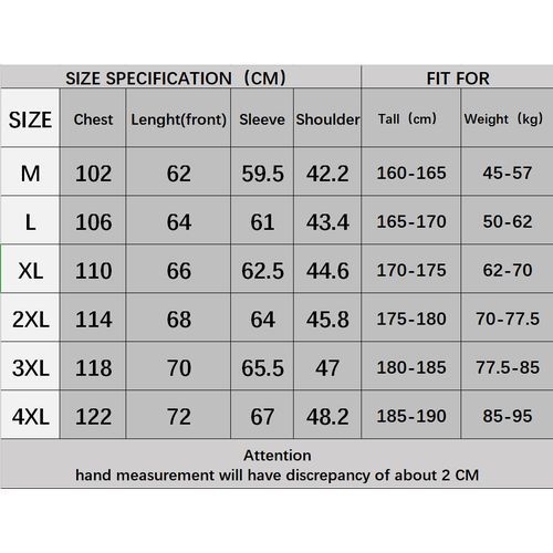 - Size 4XL for Tall:185-190(cm) Weight:85-95(kg)