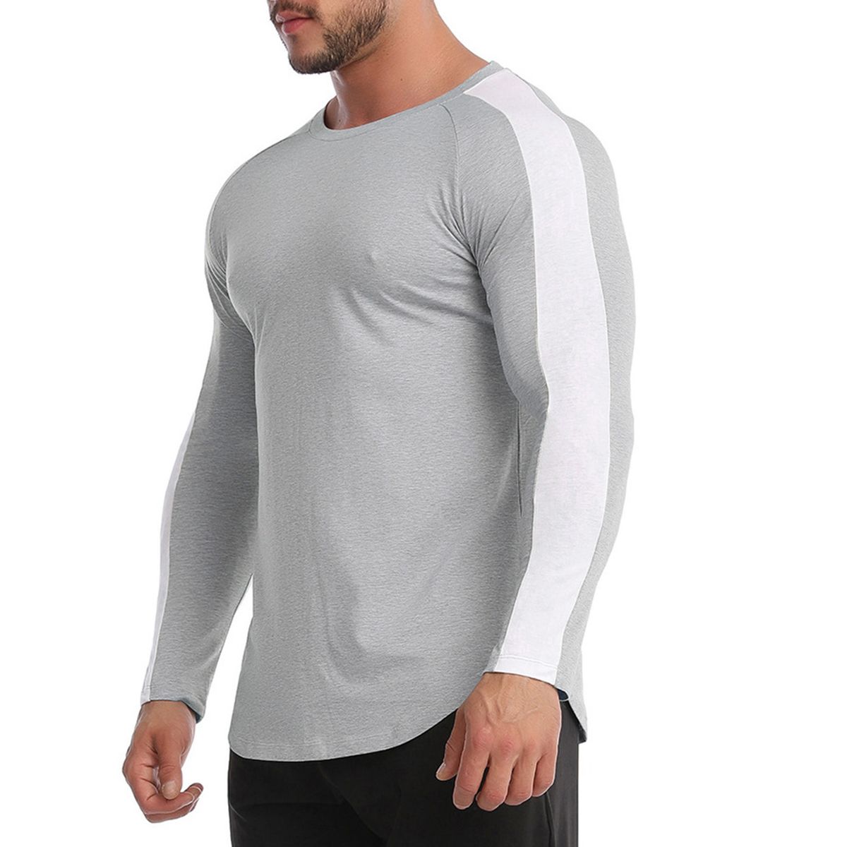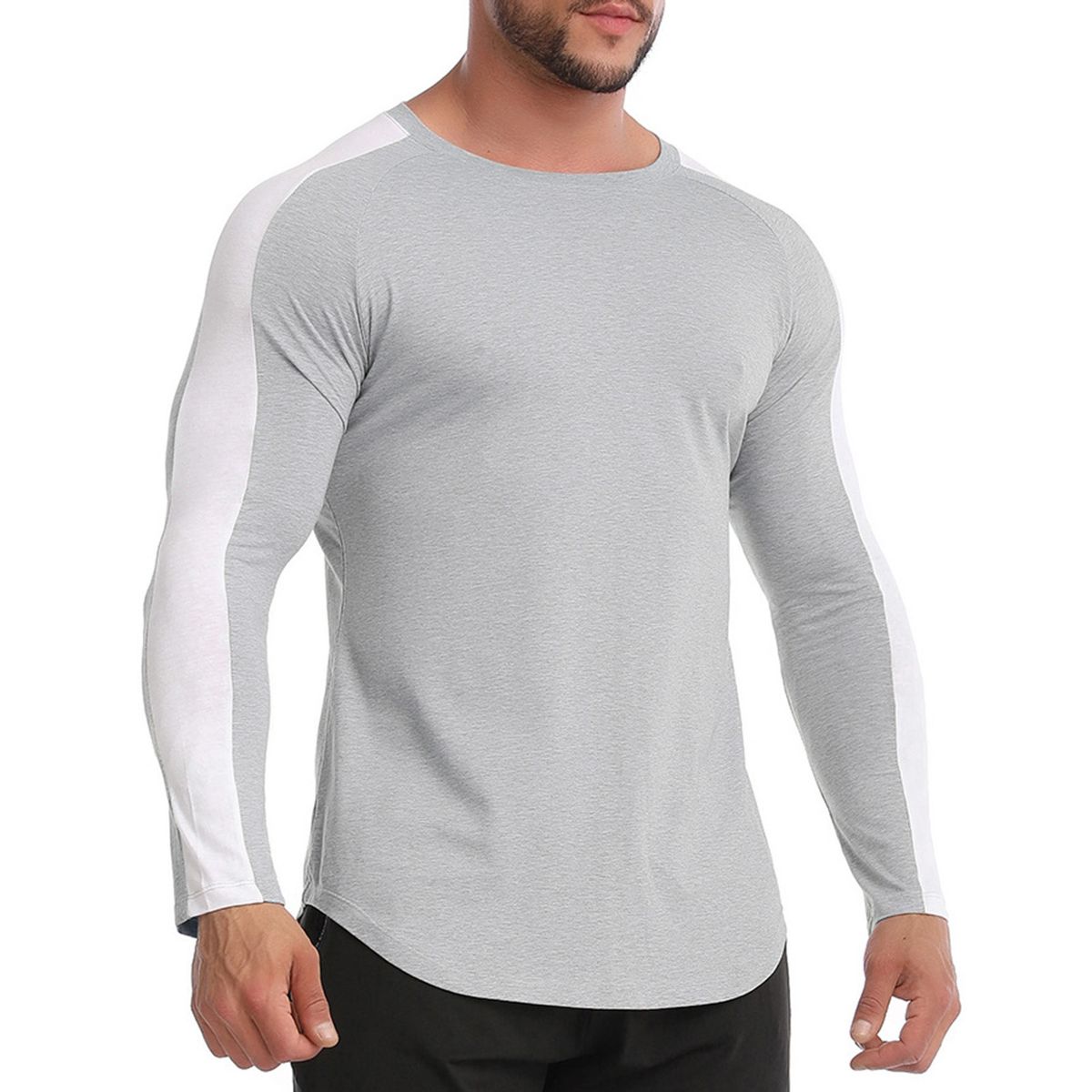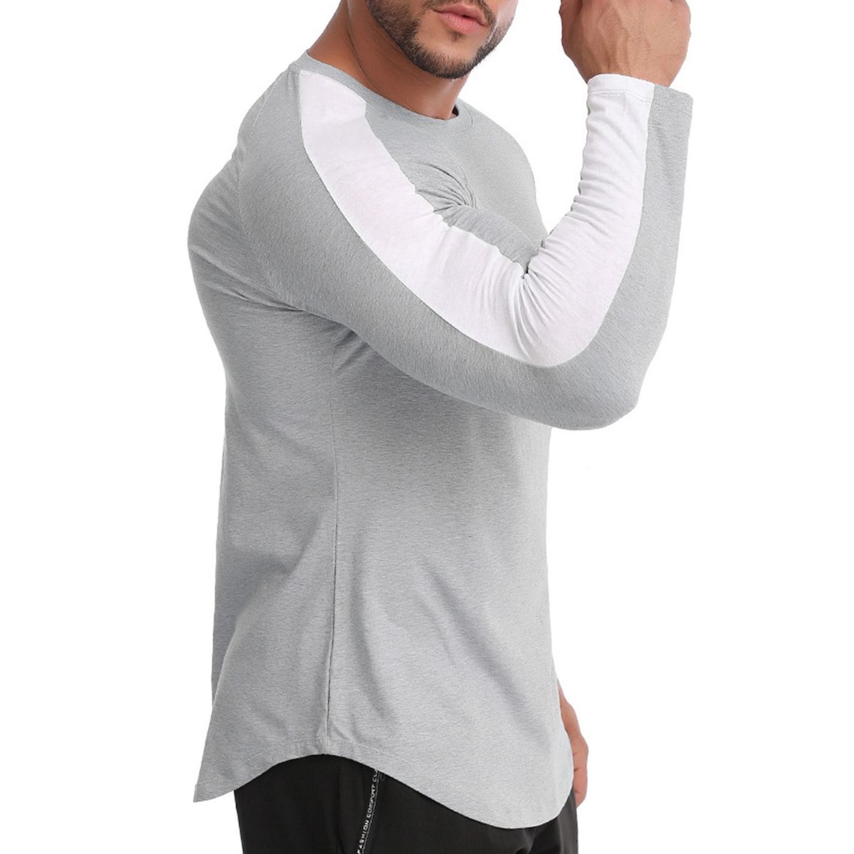 Casual long sleeves T-shirt with splicing design for lounging, and sports. It has round neck, raglan long sleeves, curved hemline and slim-cut that hug the body.