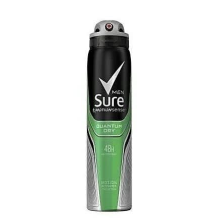 Sure Men Quantum Dry Anti-perspirant Deodorant Aerosol, from the UK's No.1 anti-perspirant brand, has been developed to give you cutting-edge protection against sweat and odour. With Sure, you're always protected for whatever happens. It also contains Sure & rsquo;s innovative MotionSense technology. It works like this: unique microcapsules sit on the surface of your skin. When you move, friction breaks those microcapsules, and they release more fragrance. Every time you move, MotionSense keeps you fresh and free from odour. Whether you & rsquo;re working hard in the office, playing hard out and about or just meeting up with friends, Sure Men Quantum Dry will give you all the back-up you need. Sure. It won't let you down. This anti-perspirant deodorant spray has an invigorating and energising scent that combines fresh citrus, spices and wood tones. So, get all-day freshness and 48h protection from sweat and odour from morning to night with Sure Men Quantum Dry anti-perspirant deodorant spray. Wear what you like. Move when you want. You know you & rsquo;re protected. This anti-perspirant for men is dermatologically tested and alcohol-free*. How to use: Firstly, shake the Sure Men Quantum Dry anti-perspirant deodorant can. Then hold it 15 centimetres away from your underarm and spray evenly in a well-ventilated area. Avoid contact with eyes and broken skin. *ethyl alcohol