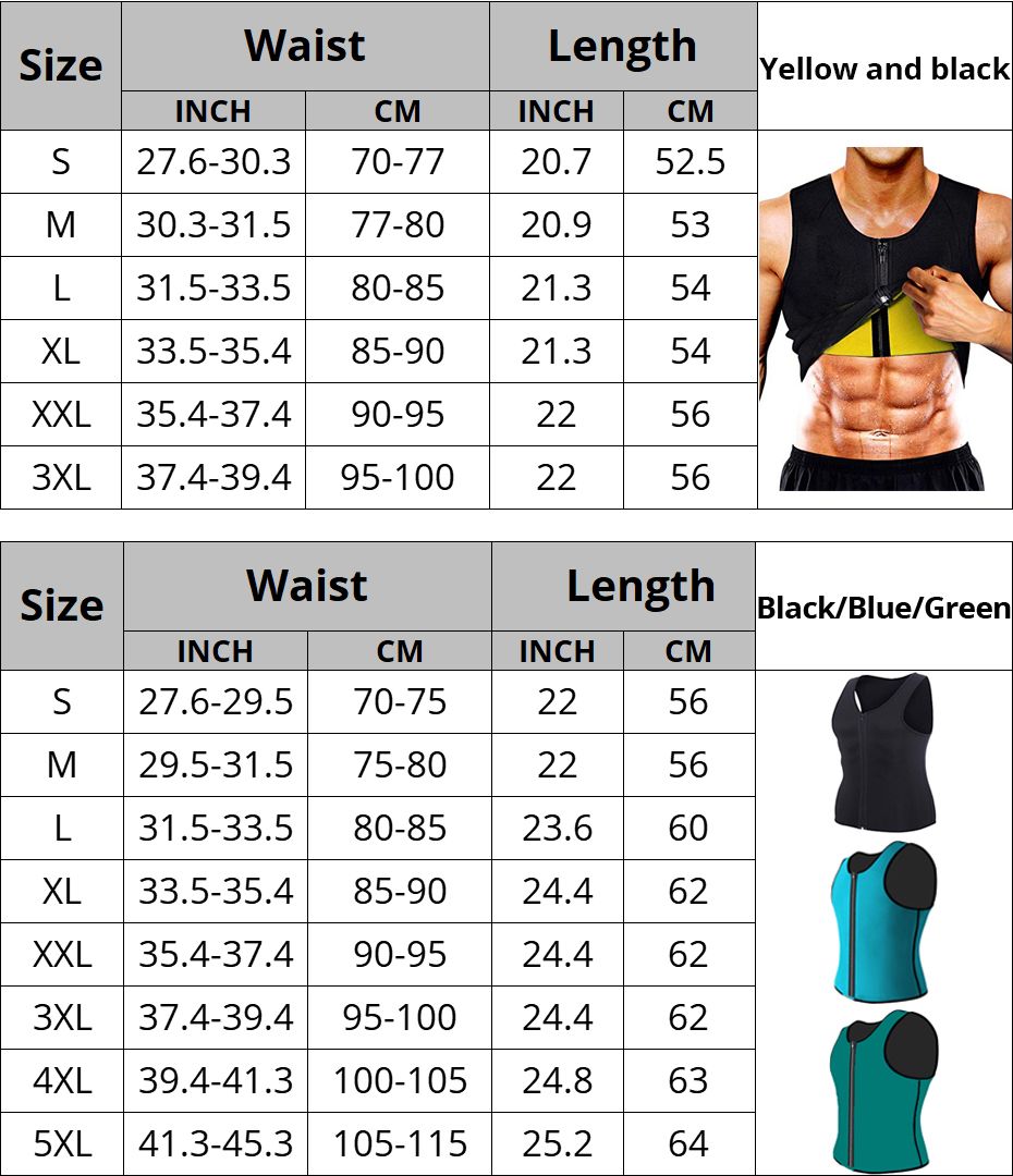 The size of the product is Asian size, not US/EU size. If you have any questionsabout the size, please leave us a message about your waist (cm) and weight (kg).Daily care instructions:Hand washDo not tumble dry or wringDo not bleach or ironLine dry or hang dry only(only in warm water less than 30 ° C hand wash,no bleach, avoid too much exposure to the sun, because it may lead to elastic burst bubbles)About chromatic aberration.There might be sightly difference in color because of the computer monitor settings. Online shopping cannot be completely avoid chromatic aberration, please take carefully who are serious to colors.Wholesale and drop shipping are both welcomed?For wholesale, we will offer discount or free shipping which only takes 3-7 days to arrive.For drop shipping, we could send the goods to your customers directly and wont leave information about us if youd like to.How can I trace my parcel?You can trace your parcel on the following website using your tracking number: www.17track.net/en (Copied to the browser to open)What can I do when purchase protection time is running out?If your purchase protection time is running out, please contact us and we can help you to extend it. So your money will not go to my account.Men Neoprene Sauna Suit Hot Body Shaper Corset for Weight Loss with Zipper Waist Trainer Vest Tank Top Workout ShirtMen Neoprene Sauna Suit Hot Body Shaper Corset for Weight Loss with Zipper Waist Trainer Vest Tank Top Workout Shirt