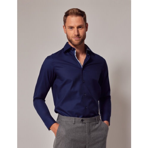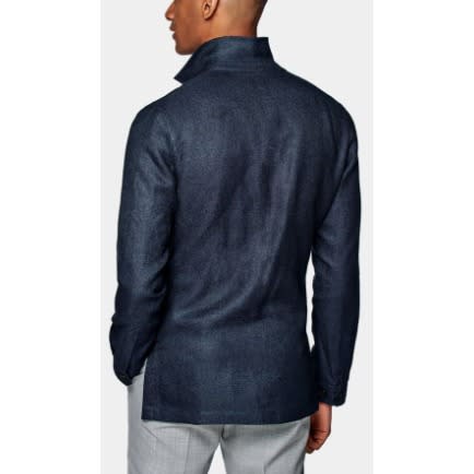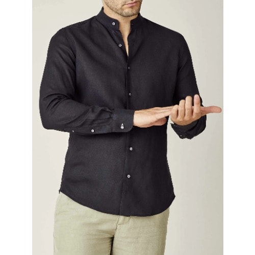 A timeless classic with a modern flair, the cotton-blend collarless & lsquo;grandad & rsquo; navy shirt is having a huge revival for everyday styling.