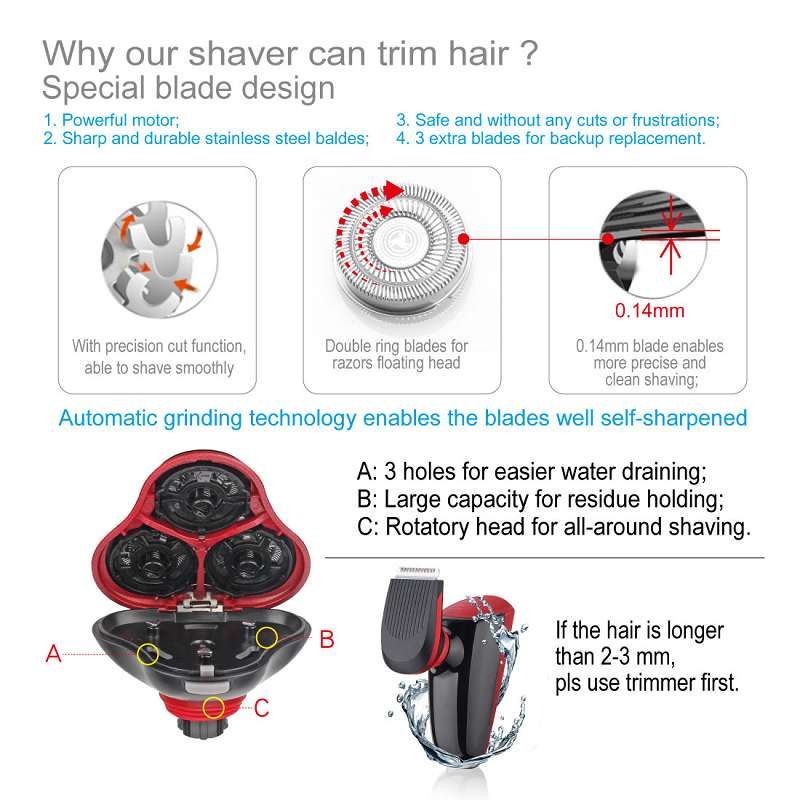 Special design, powerful motor, 3 drain holes, easy for water cleaning. Large bin,hold more hair wastes. Swing shaver head, make closer shaving.