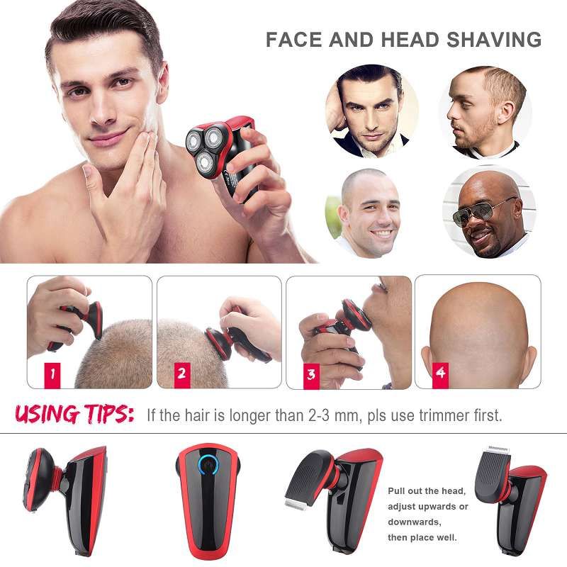 Multi function dual head rotary shaver/trimmer. Special design adapts to all shaving/grooming surfaces from face, head to the body (Beard Trimmers , Hair Trimmer, Balding Head Shaver, Double Heads). Long lasting battery for more than 60-min-operations after 3 hours charge (convenient