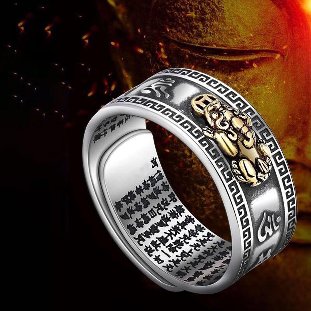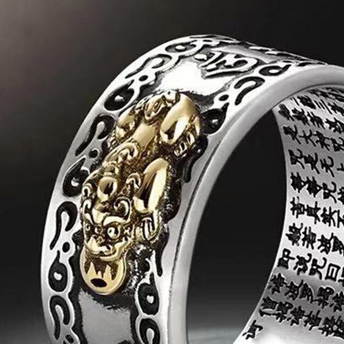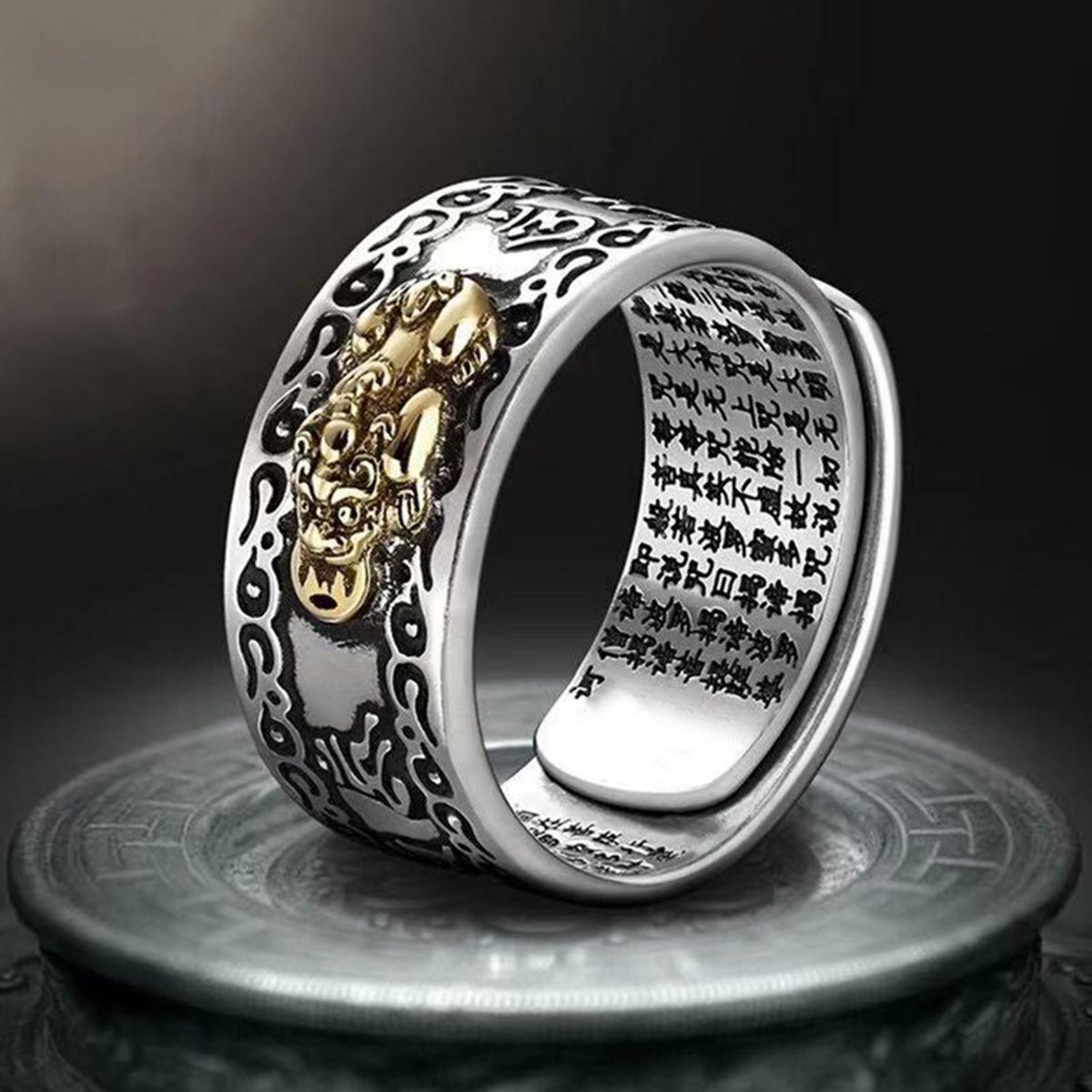 The ring, which has engraving sutra character and Chinese mythical animal decor, can add the sense of fashion and uniqueness and show your personality to help you create a cool and trendy style.