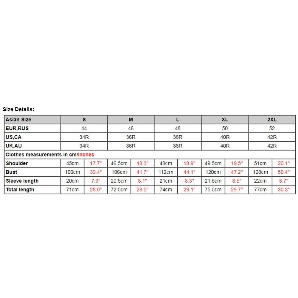 Size: S (US34R UK/AU34R EU44) / M (US36R UK/AU36R EU46) / L (US38R UK/AU38R EU48) / XL (US40R UK/AU40R EU50) / 2XL (US42R UK/AU42R EU52) (optional)