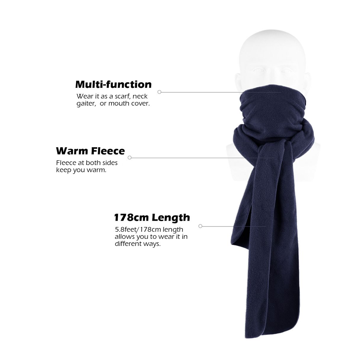 Long scarf with fleece finish for winter. 70.1 quot; long length allows you to wear it in different---try it as a neck gaiter, a mouth cover, a head cover according to the weather. Fleece finish efficiently keeps you warm, and it is lightweight to carry and wear. Have it for traveling, climbing, hiking or camping.