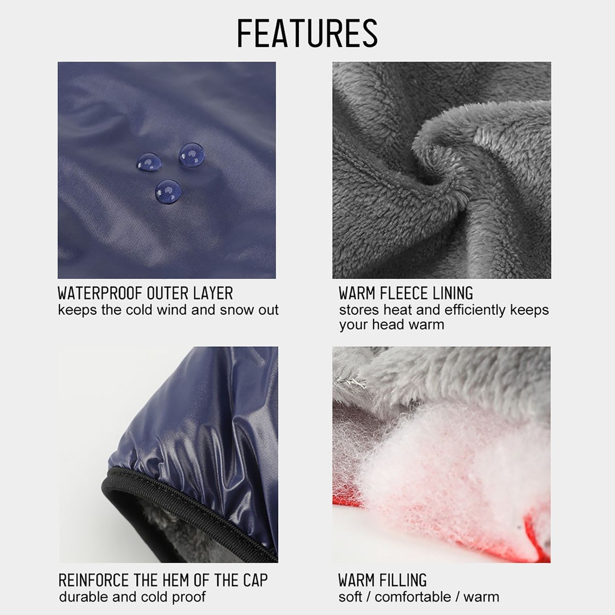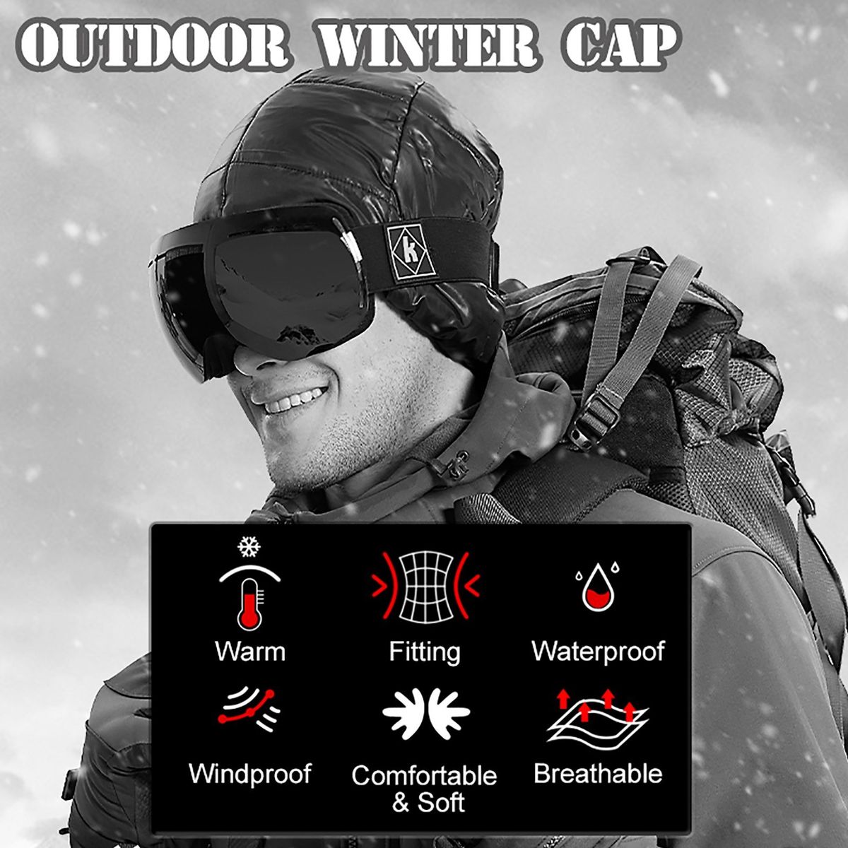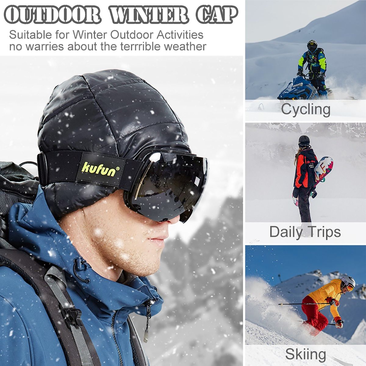 This outdoor winter fleece cap keeps you warm in freezing winter days and protect your head from cold wind, rain and snow. Put it on to enjoy cycling, skiing and skating! Pair it with safety goggles.