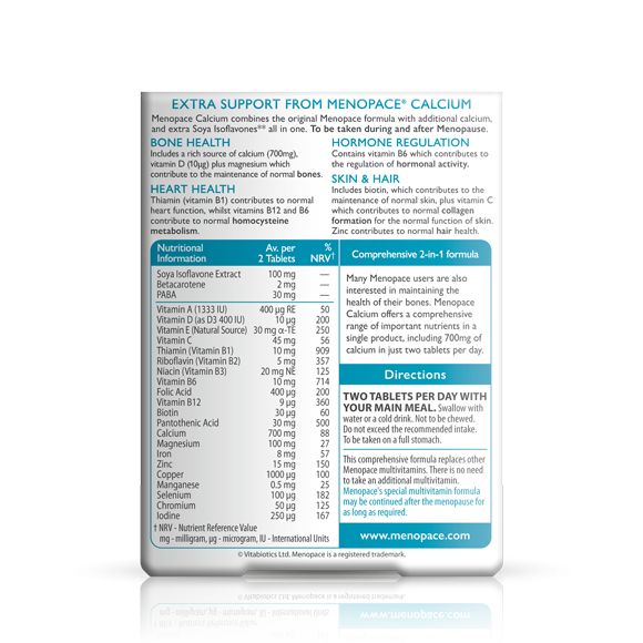 Menopace Calcium is specially formulated to provide advanced support for women, to be taken during and after the menopause, combining the original Menopace formula with added calcium which is needed to help maintain normal bones. The unique formula of 24 nutrients includes vitamin B6 which contributes to the regulation of hormonal activity, as well as 100mg Soya Isoflavones.Bone Health;