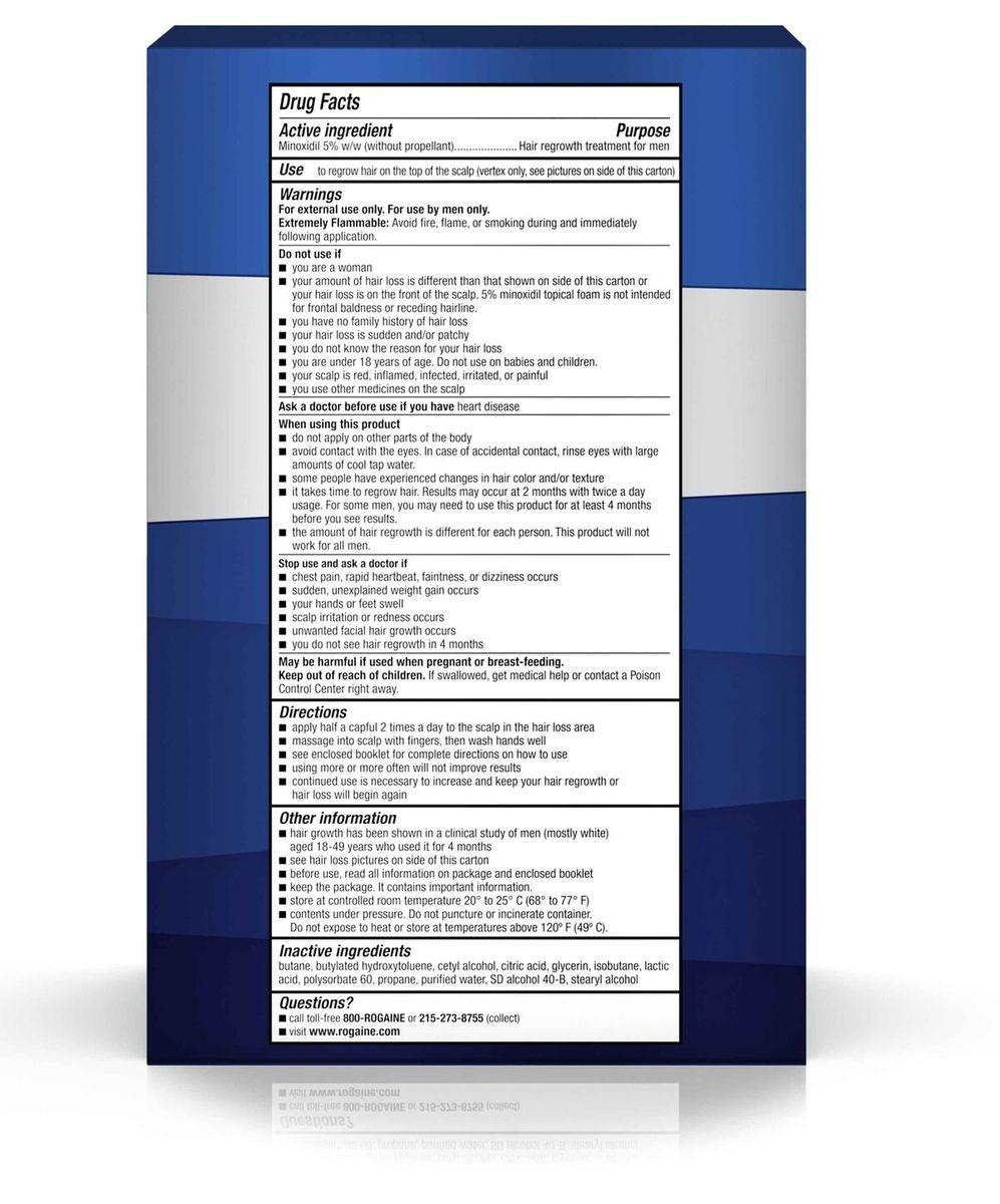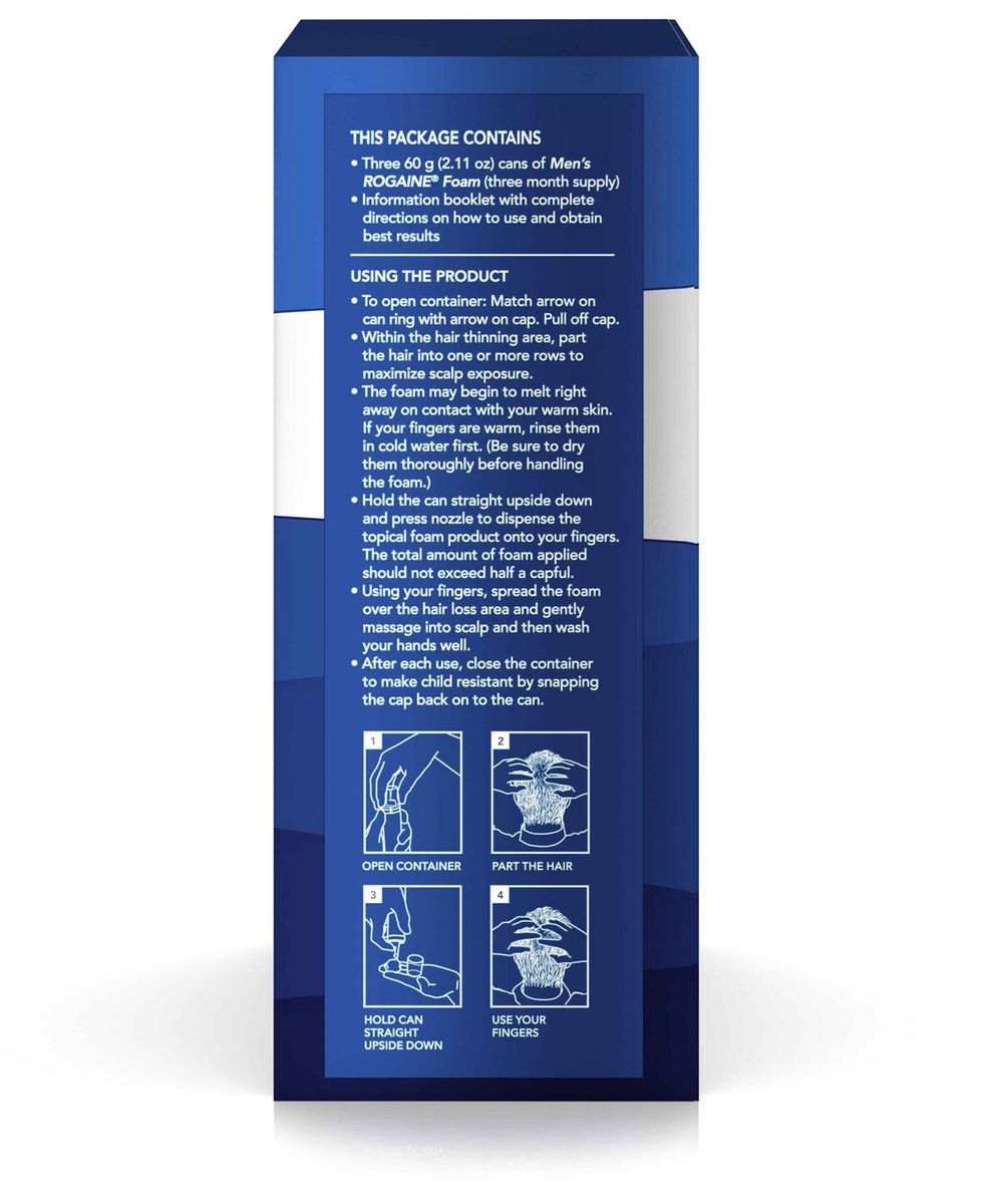 3-month supply of Men's Rogaine 5% Minoxidil Foam treatment for hair regrowthFormulated with 5% Minoxidil, this topical foam helps treat hair loss and maintain hair densityOur fast-working hair regrowth treatment is clinically proven to regrow up to 25% more hairIdeal for use at the early stages of hair thinning and allows for the regrowth of fuller hairThe 5% Minoxidil formula works to boost hair follicle activity and hair protein productionTricho-Prime Technology works on contact to create a healthy hair regrowth environmentFrom the #1 dermatologist-recommended brand, this anti-hair loss foam also conditions the scalpMen's hair growth treatment comes in an easy-to-apply foam designed to fit into your daily routine