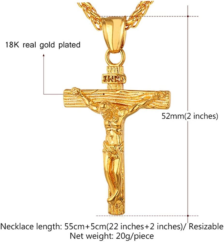 - INRI Cross Pendant: 2" x 1" (L*W), Chain Length: 22 inches/resizable. Net weight: 20 grams.