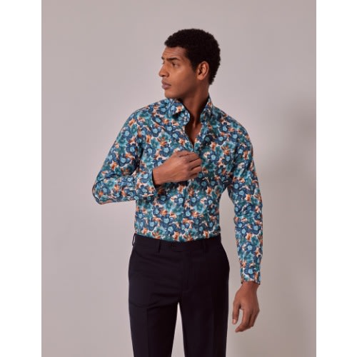 Buy Men's Curtis Blue & Cream Foliage Floral Slim Shirt - Mid-collar in Nigeria