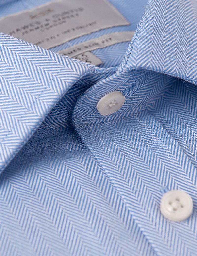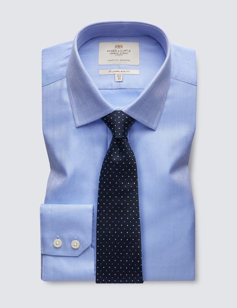 blue herringbone shirt is suitable for a range of occasions. Our luxury two-fold cotton shirts have been perfected with a unique silk touch finish which creates a smooth, silky surface.
