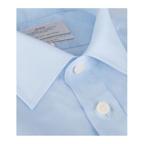 The slim fit formal shirts are the newest and most fitted in our range and have been designed to create a contemporary, sleek silhouette. This men's blue poplin shirt is sharp, current and beautifully crafted from luxurious