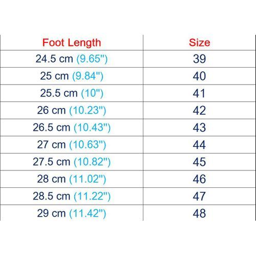 US 8.5 = EU 42/ CN 42 = foot length 260 mm; US 9.5 = EU 43/ CN 43 = foot length 265 mm; US 10 = EU 44/ CN 44 = foot length 270 mm;