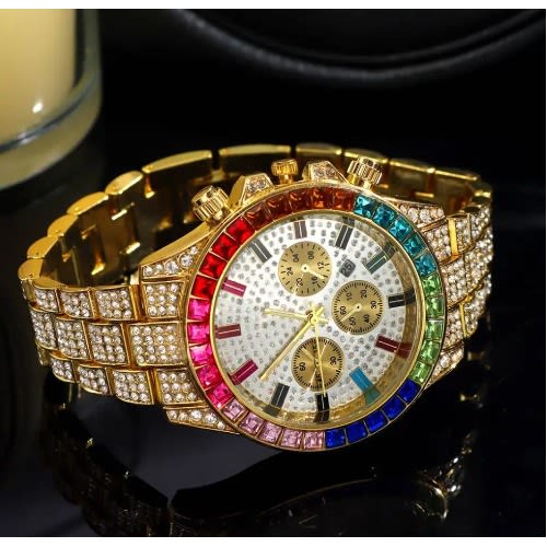 This watch is a super flashy, highly polished, 14k gold plated, ice stunned wristwatch with roman numeral iced out. This product was made to fit your flashy outfit or rich wear.Truly made into a masterpiece, crystal studded watch is customized to the fullest. Round watch in silver tone finish, featuring 28 white crystals at bezel. Its Unique Round Watch Case is inspired by what all rappers are wearing!!