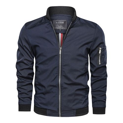 - Full zipper stand collar bomber jacket, The zipper head is on the left