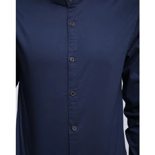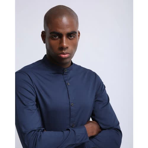 A timeless classic with a modern flair, the cotton-blend collarless & lsquo;grandad & rsquo; navy shirt is having a huge revival for everyday styling.