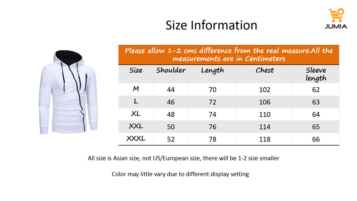 NOTE: Please allow 1-2 cms difference from the real measure. All the measurements are in CM (Refer To Size Chart) All size is Asian size, not US/European size, there will be 1-2 size smaller Color may little vary due to different display setting