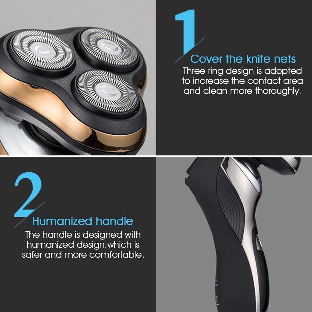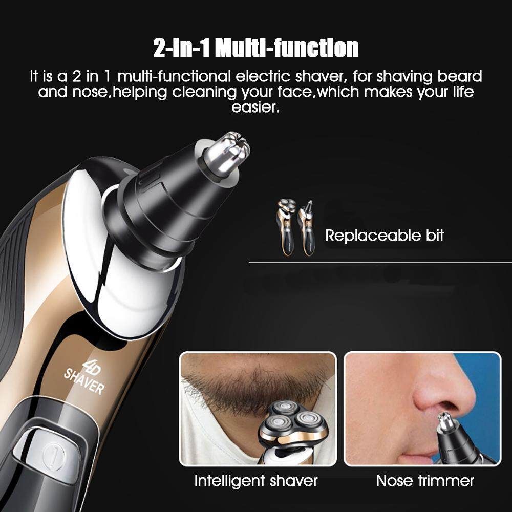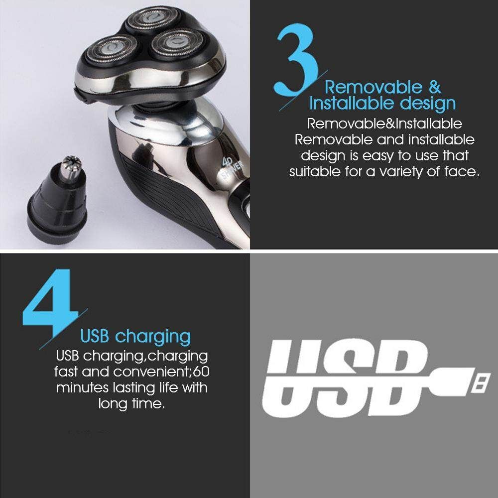 Men's Electric Foil ShaverElectric RazorFully WashableIntelligent4D Rechargeable ShaverUSB Charging For Shaving Beard And Nose Features: -2-in-1 Intelligent It is a 2 in 1 multi-functional electric , for shaving beard and nose,helping cleaning your face,which makes your life easier. -Humanized handle design Threeheaddesign The handle design is designed with humanized design, which is safer and more comfortable.Threeheaddesign is adopted to increase the contact area and clean more thoroughly. -Removable Installable design Detachable and installable design is easy to use that suitable for a variety of face. -USB charging Lasting life USB charging, charging fast and convenient;60 minutes lasting life with long time. -Intelligent4D Shaving Innovative Sonic technology helps capture even hard to catch hair with 10,000 microvibrations. It captures flat-lying hairs in problem areas. -Waterproof/Wet and Dry The whole body of this electric is washable, allows you a comfortable dry shave or a refreshing wet shave with shaving or for easy handling. Specifications: Model: Smart4DShaving : Silver/Gold Material: ABS : USB rechargeable Shaving head: rotating 3 head Charging time:8hours Use time: 60 minutes Maximum :3W Voltage: 110-240v Frequency: 50 / 60Hz Usage: Wireless use Package Includeds: 1 *Intelligent 1 *Nose trimmer 1 *Cleaning brush 1 *USB charging cable