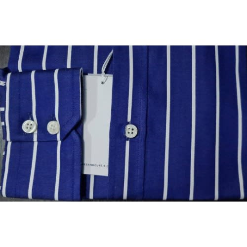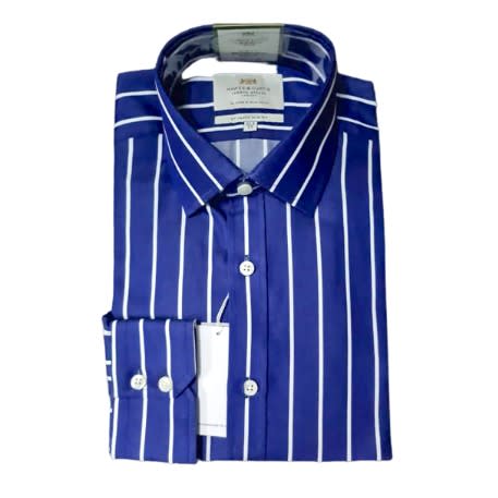 A rich navy blue and white bold stripe shirt in luxurious cotton for a smooth and soft handle. The relaxed slim cut helps achieve a smart laidback look for those wanting style and comfort; Designed with gentle tapering for subtle definition.At Hawes and Curtis we appreciate that our clientele lead busy lives, and as a solution we have introduced our non-iron range. These shirts utilise the latest anti-crease technology which lasts much longer than other non-iron shirts.