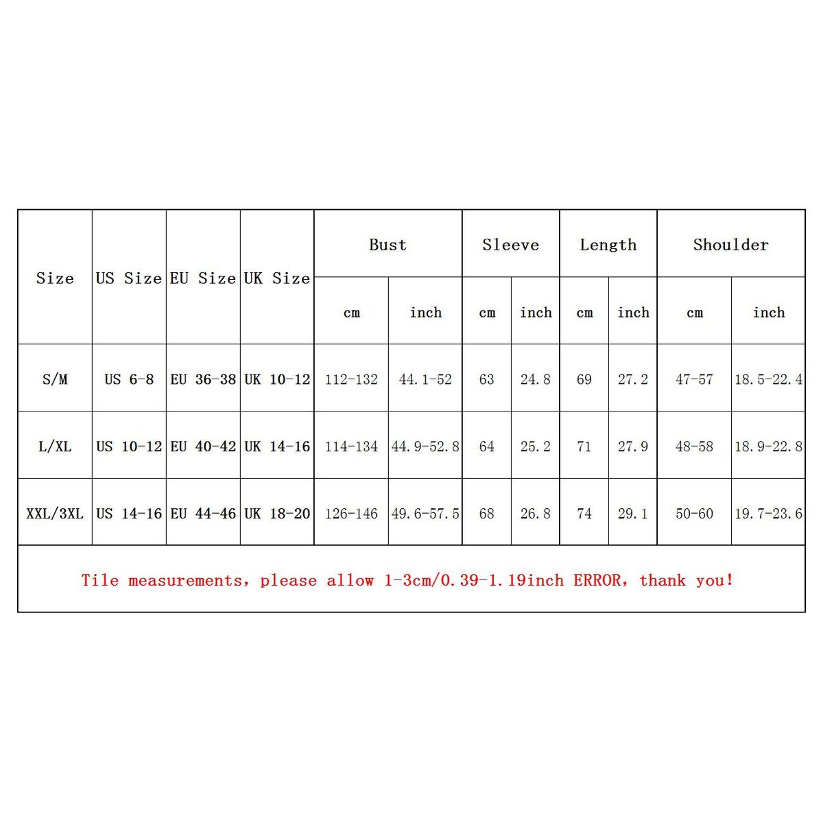 Size: S/M=US(6-8)=EU(36-38)=UK(10-12), Bust: 112-132cm / 44.1-52 inch, Sleeve: 63cm / 24.8 inch, Length: 69cm / 27.2 inch, Shoulder: 47-57cm / 18.5-22.4 inch