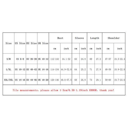 Size: S/M=US(6-8)=EU(36-38)=UK(10-12), Bust: 112-132cm / 44.1-52 inch, Sleeve: 63cm / 24.8 inch, Length: 69cm / 27.2 inch, Shoulder: 47-57cm / 18.5-22.4 inch