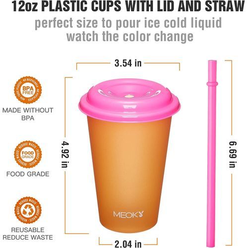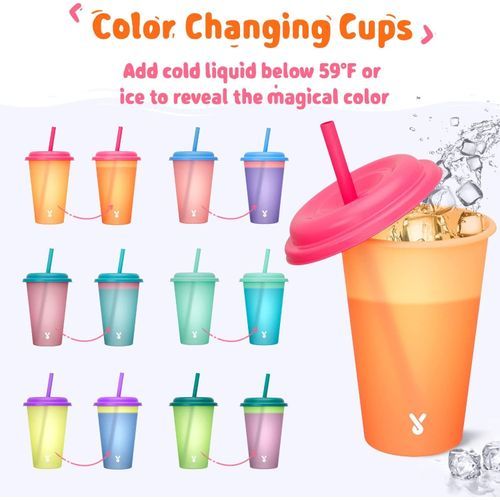 EASY TO CARRYIt is easy to take these plastic cups and lips outside and save space by stacking them. Enjoy the colorful holiday and summer ahead with it! | GO UNIQUE AND MAKE YOUR OWN CUPSColor-coordinated lids and straws come with each cup, so you can pair them according to your preference. And you can apply your favorite vinyl designs to these reusable color changing tumblers. | CONVENIENTA circular ring is built around each straw to prevent it from falling off. 6/12 pack of cup is versatile enough for every day use. |