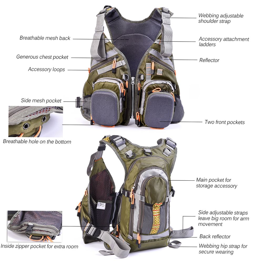 Multi Zipped Pockets: Four generous chest pocket, four zipped front pockets, two side mesh pocket, and 2 generous back pocket in total.
