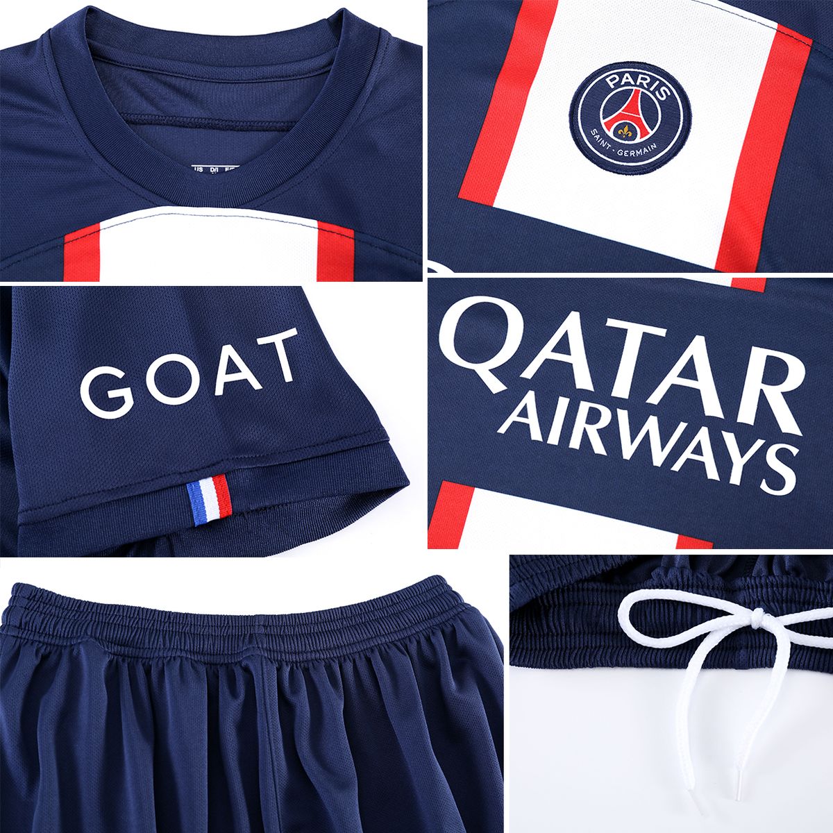 This Paris Saint-Germain football kit includes: 1 t-shirt, 1 pair of shorts, 1 pair of socks and 1 pair of knee pads.The design of this uniform is inspired by the professional player