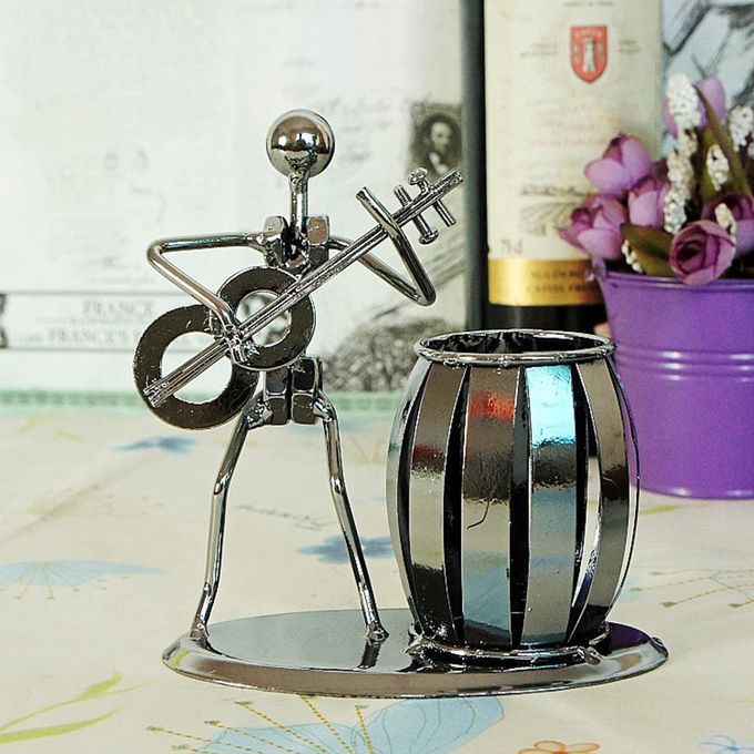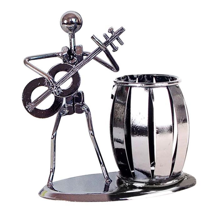 Desktop organizer featuring a barrel-shaped pencil holder to a metal man playing an electric guitar.
