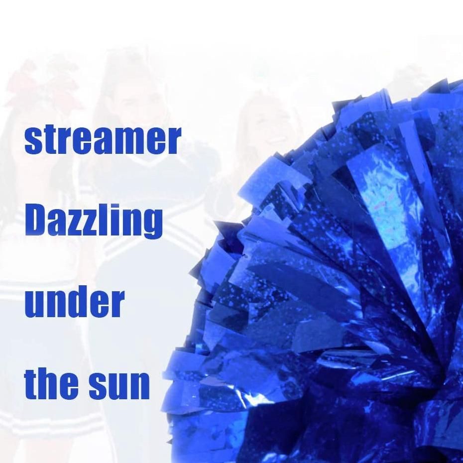 []Our cheerleader pom poms are made of PET material with a white hard plastic handle. They are durable and reusable. They have a metallic foil on their surface, which makes their look glossy. safe and have no odor, you can use them with confidence. No matter how you wave it, the silk will not fall off easily