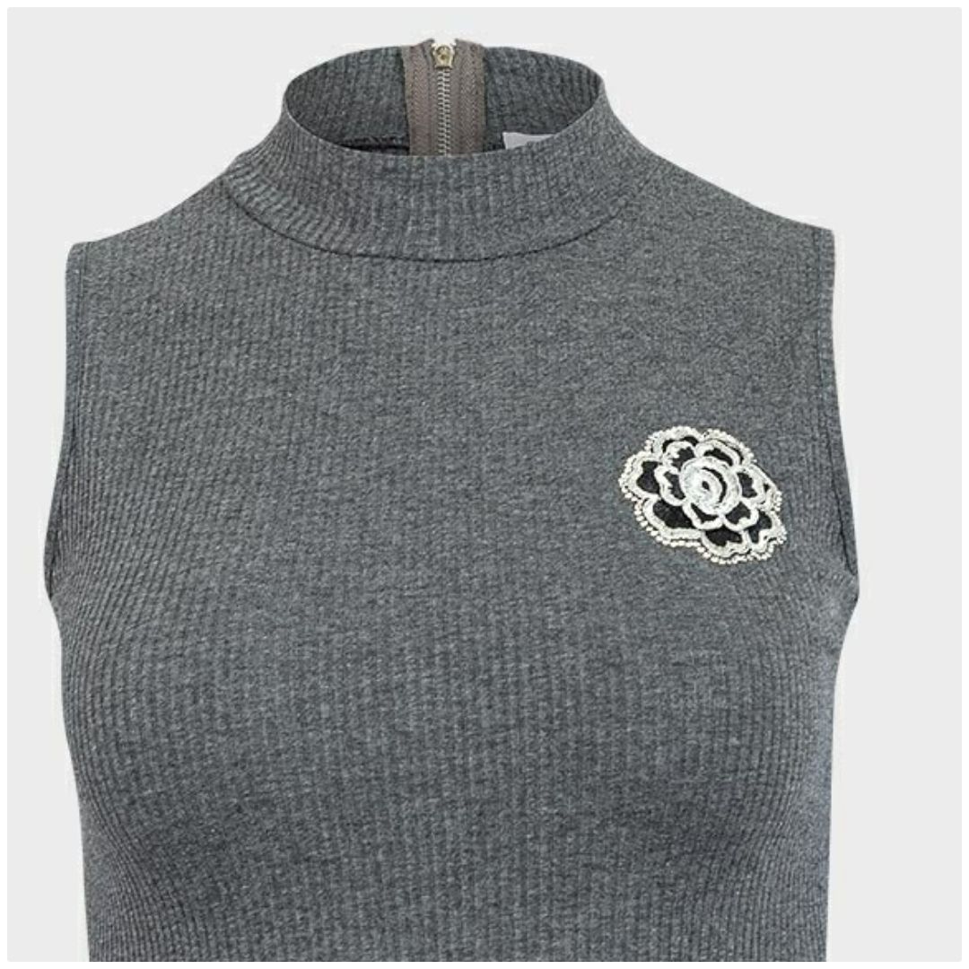 Made from a stretch knitted fabricHigh necklineRibbed designZip fastening to backRose applique to chestFigure fitAffordableYou deserve this beautiful top.