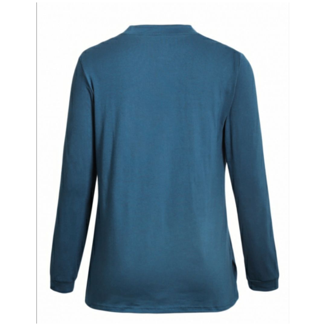 Crisp yet casual, jersey pulloverHalf placket dotted with snap fastenerBanded collar, long sleeves and sides slitSimple fashion design make it well received by ladiesThe solid color top will make you look unique and special.