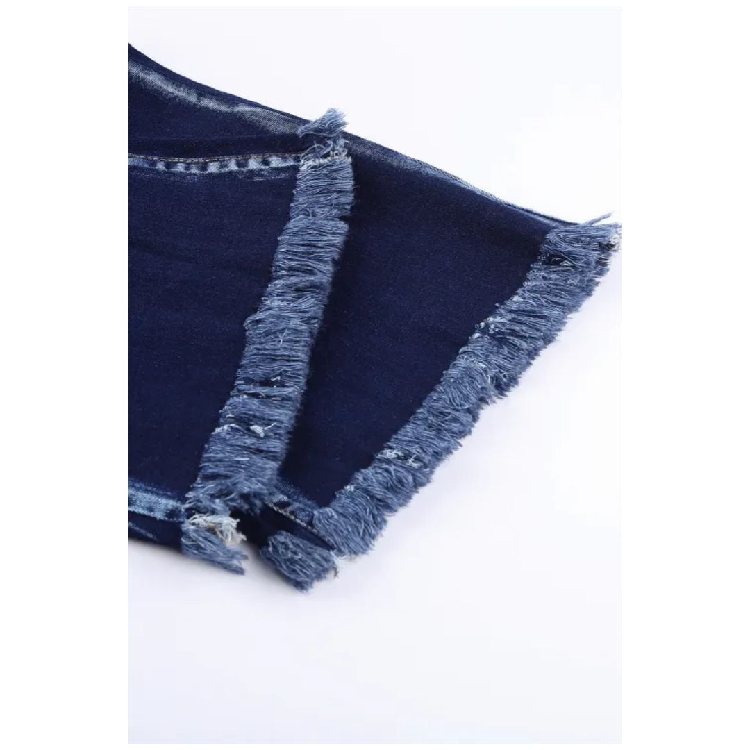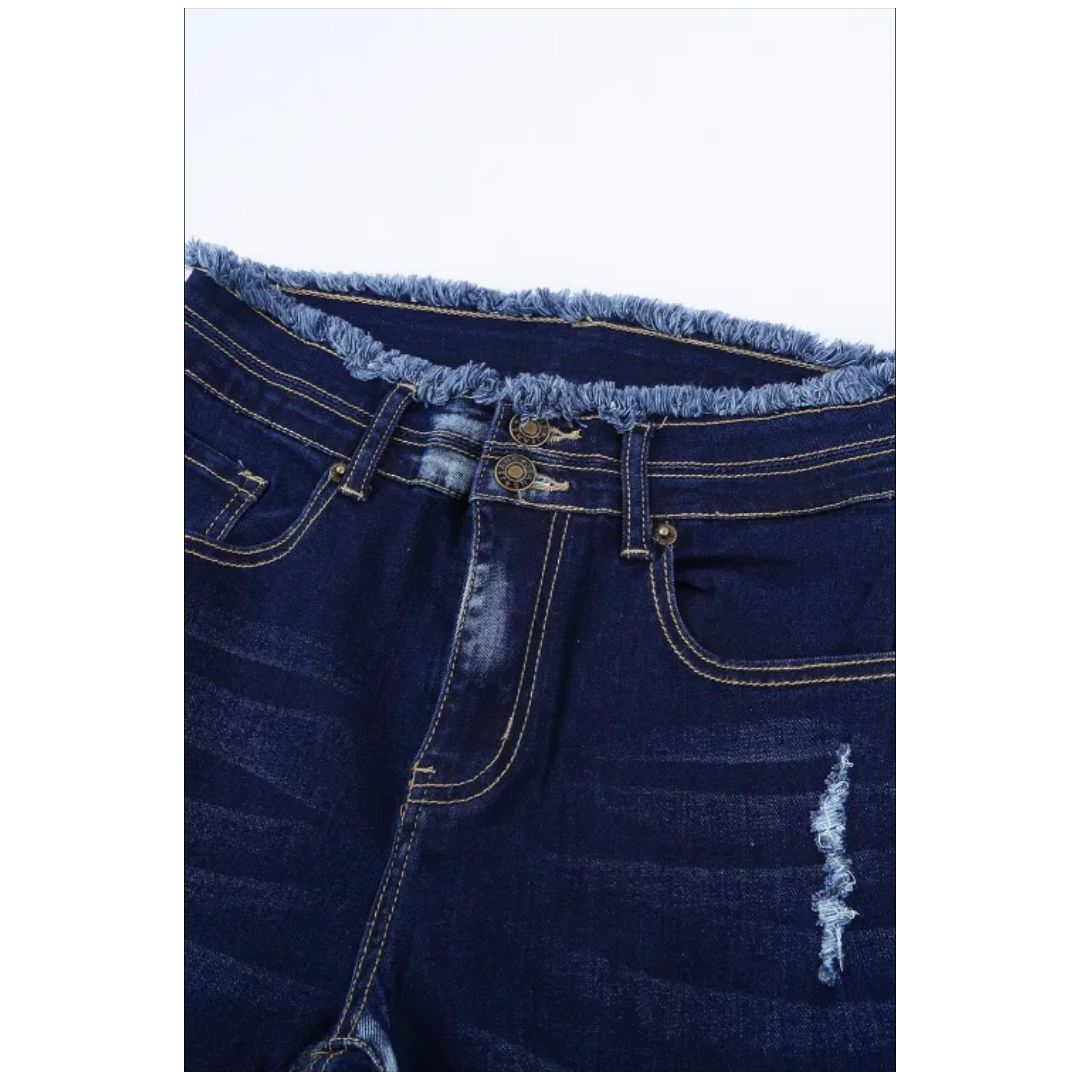 These flare jeans are easy to give a slender look in secondFrayed waistband and hemlineLightly distressed detail on the flare legsZip fly and two buttons closure, front and back pocketsWholesale jeans is easy to match with any top.