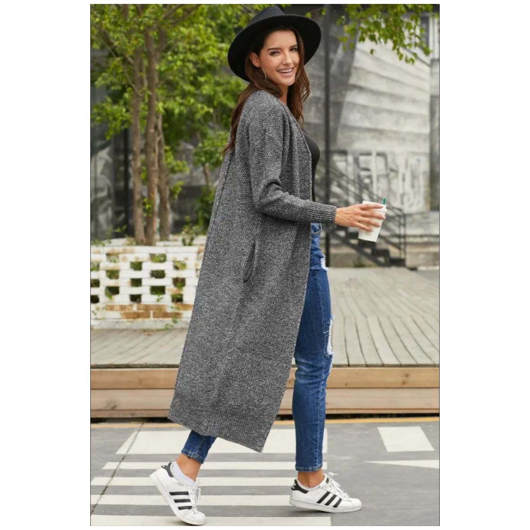 Long knit Cardigan styling casual comfortable Open Front with no button closure, pockets at sides In complementary shades of color, chic knitting pattern You'll love nothing more than cuddling up to this outwear Pairing simple tees and denim or a dress with cable knit tights.