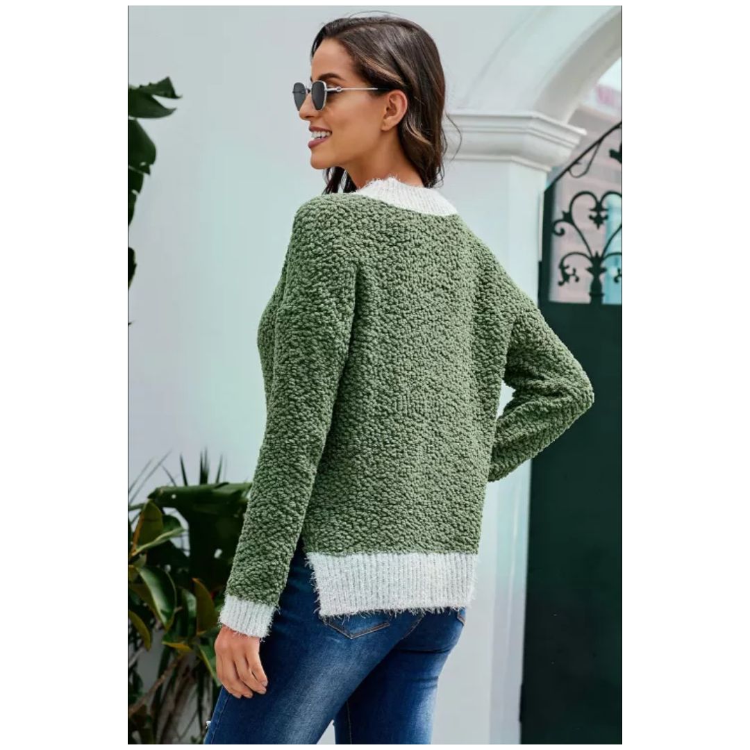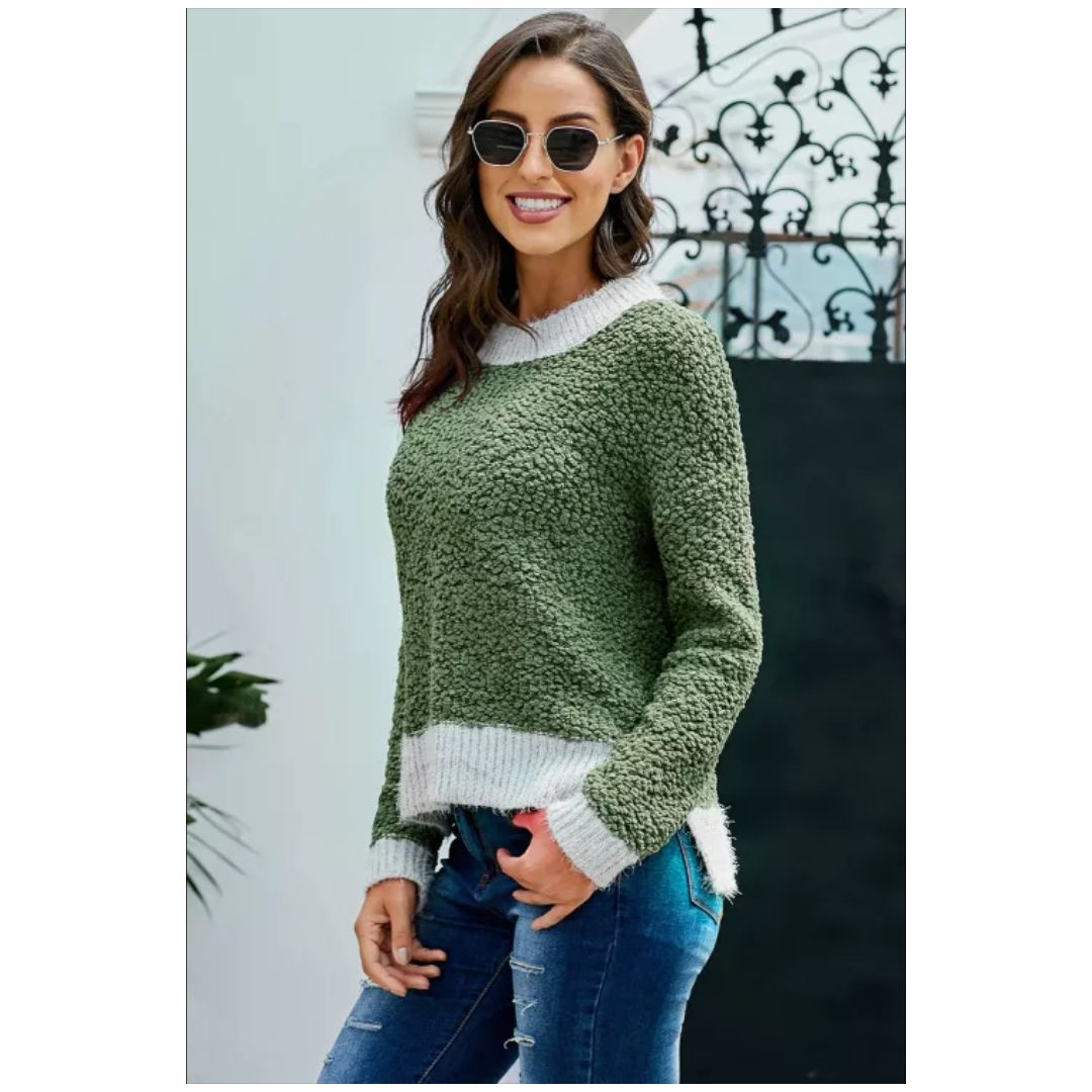 Contrast neckline, sleeve cuffs and hemline, side slits, comfortable and chic for modern ladiesWomen's autumn winter warm jumper round neck neck casual sweater solid color knitted pullover ladies popcorn colorblock top hemline split fork base shirt