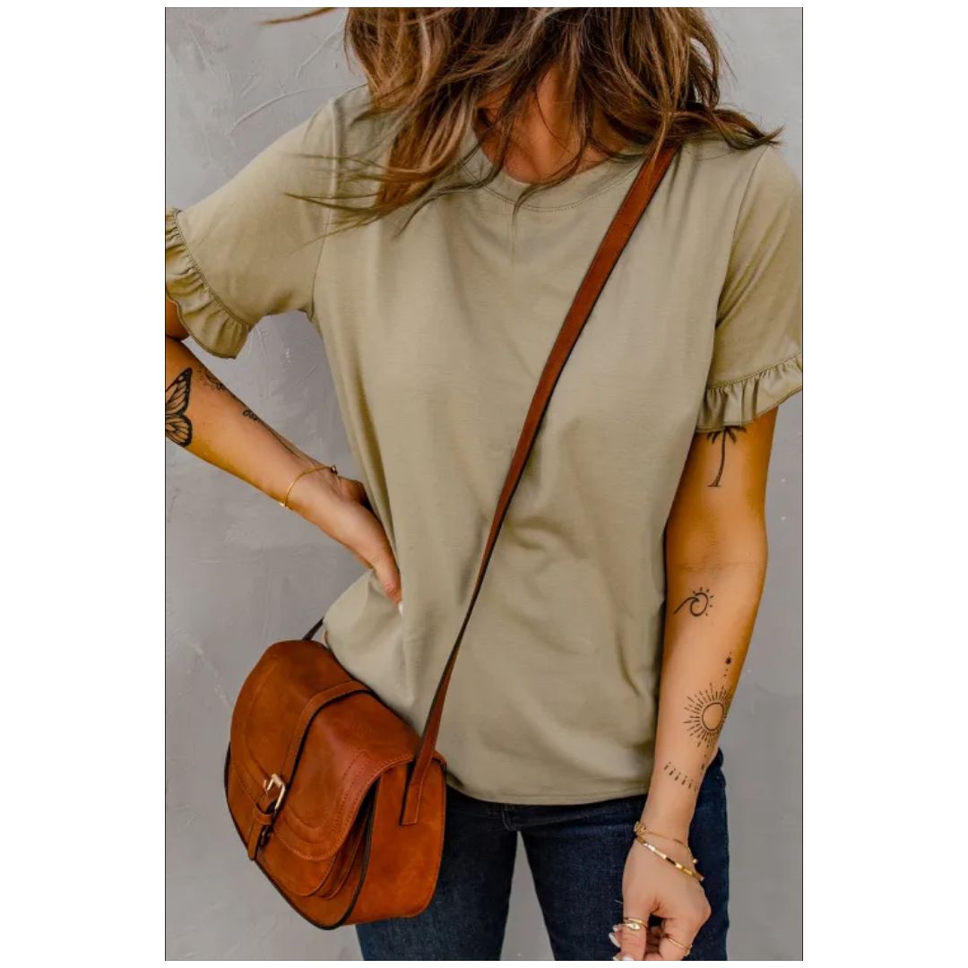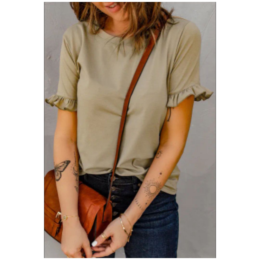 The ruffled design in the t shirt is very special and cute. Crew neck, short sleeve and regular fit silhouette to fit most body.The tee top is soft, lightweight, skin friendly and cozy to wear Solid color t shirt goes well jeans, pants, shorts, clutch and sneakers.