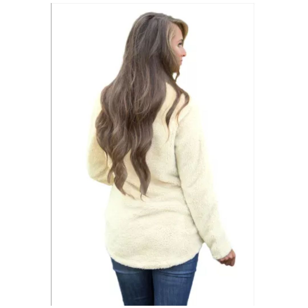 This is gorgeous zipped pullover fleece outfit is such a must have for fall and winter! We are in love with the amazing soft and fuzzy outer material! This quarter zip pullover has pockets on each side, a faux leather zipped pull detail, and a chic rounded hemline for a stylish combination! And the interior lining feels almost as amazing as the outside!