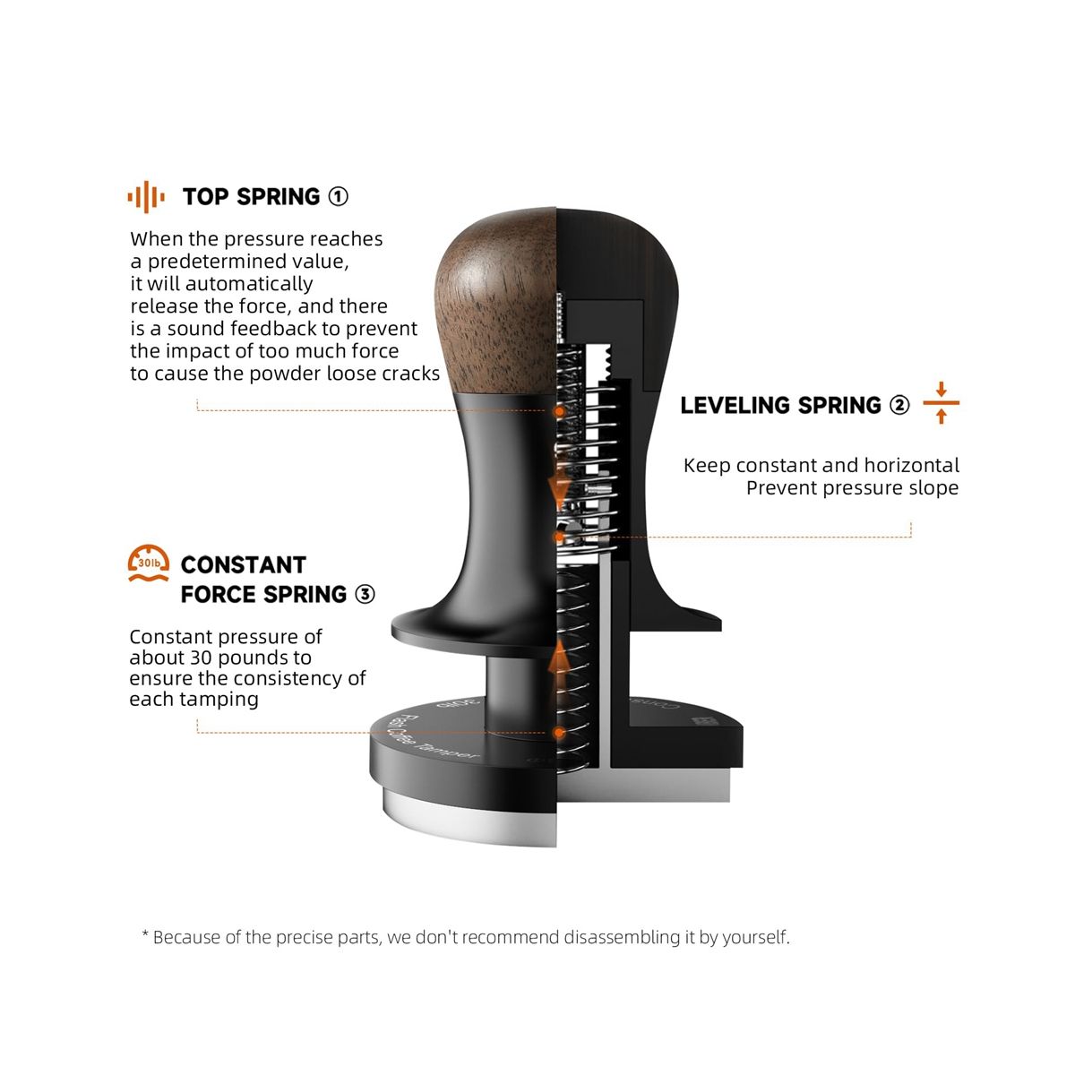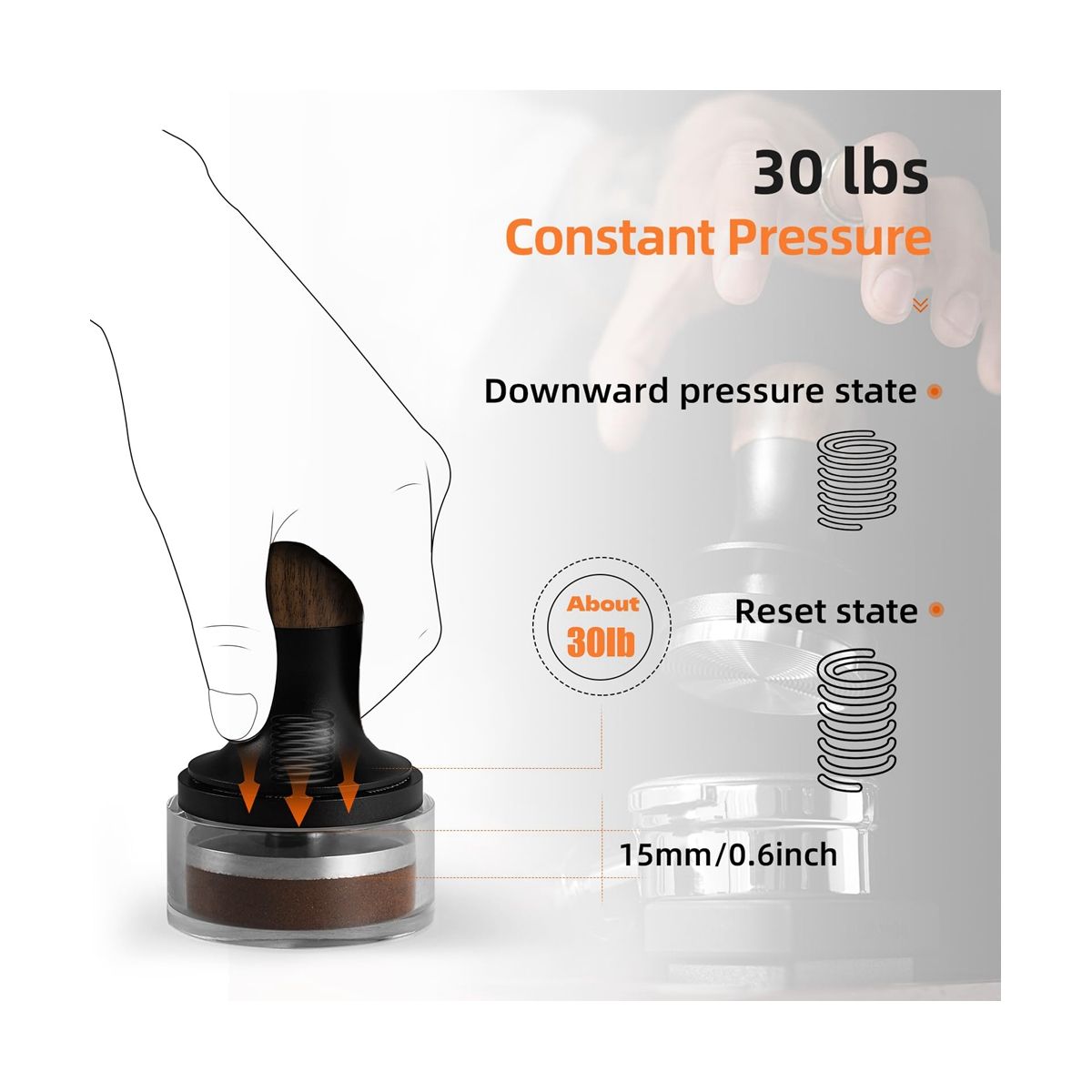 Triple Spring Tamper: The espresso tamper features an triple spring design that not only maintains a constant pressure of 30 lbs, but also provides audible feedback.