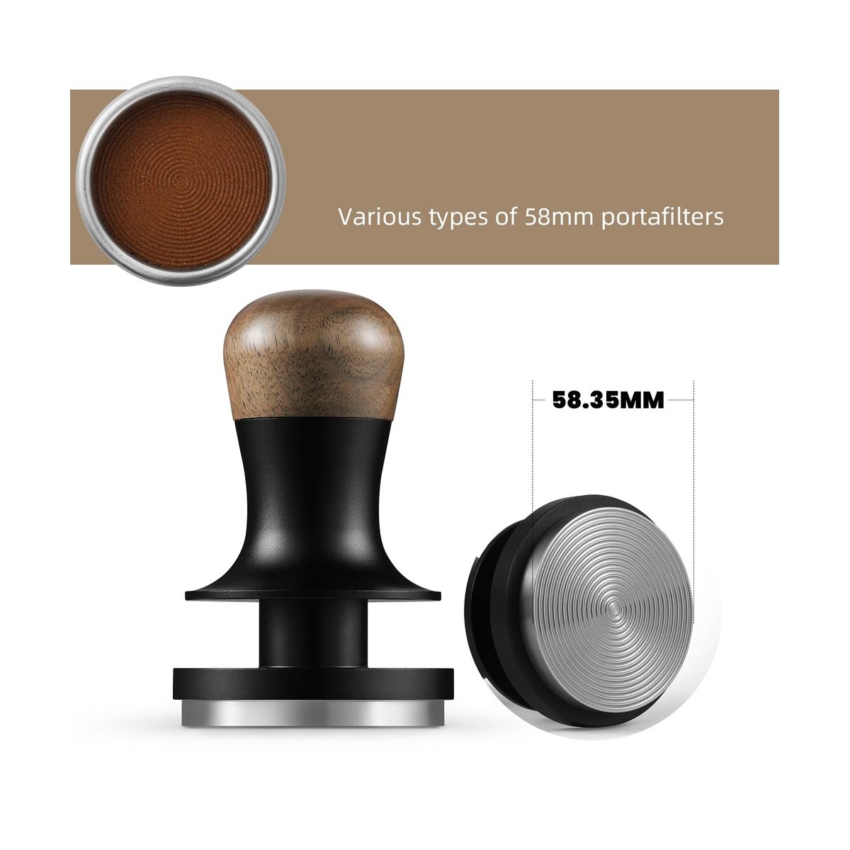 Fits 58mm Brewers: The diameter of the espresso tamper base is 58.35mm, which allows for a better fit between the tamper and the brewer basket, effectively reducing residual powder on the edge of the basket. Compatible with most 58mm coffee machine handles on the market, such for Breville, DeLonghi, Gaggia, La Marzocco, Saeco, Acaso, etc.