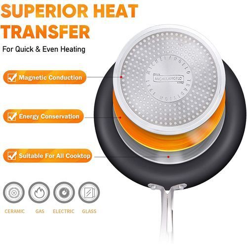 Premium Nonstick InteriorUltra nonstick ceramic interior allows you to cook with less oil or butter for healthy cooking. | Tri-ply Construction BaseDurable 3 layers bottom provides better performance of even heat distribution and warp-resistance, releasing foods effortlessly. | Effortless to CleanThe durable and wear-resistant exterior makes it dishwasher safe and super easy to handwash. | Oven SafeSuitable for use on all stove tops except induction. Oven safe up to 450°F |
